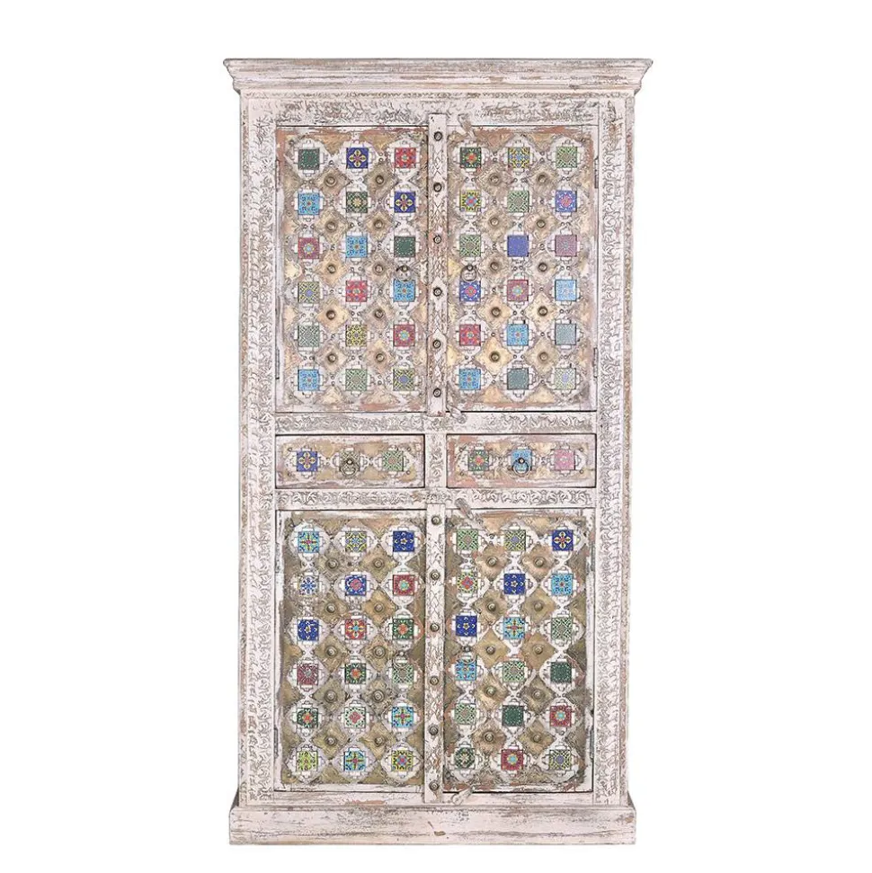 Der Wohnzimmerschrank „Mirell“ überzeugt auf den ersten Blick mit seinem unverwechselbaren Shabby Chic-Stil. In einem charmanten Antikweiß mit farbenfrohen Akzenten gehalten, strahlt er nostalgisches Flair und stilvolle Leichtigkeit aus. Die kunstvoll gestaltete Front mit bunten Mini-Keramikfliesen, die florale Muster zeigen, macht den Schrank zu einem echten Blickfang. Mit seiner Höhe von 185 cm und einer Breite von 100 cm bietet „Mirell“ eine großzügige und stilvolle Möglichkeit, Ordnung ins Wohnzimmer zu bringen.