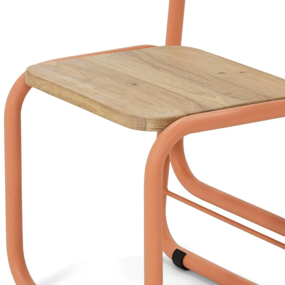 Der „Elhera“ überzeugt durch seine edlen Materialien: Die Tischplatten bestehen aus massivem Eichenholz, das nicht nur robust, sondern auch äußerst stilvoll ist. Die abgerundeten Kanten der Platten sorgen für ein elegantes Finish. Das Stahlgestell, pulverbeschichtet in einem ansprechenden Terracotta-Ton, bietet nicht nur eine pflegeleichte Oberfläche, sondern auch ein modernes Bügeldesign, das dem Tisch eine raffinierte Note verleiht.