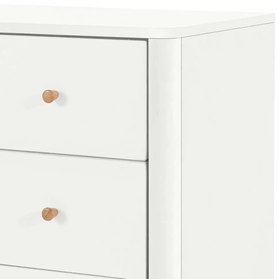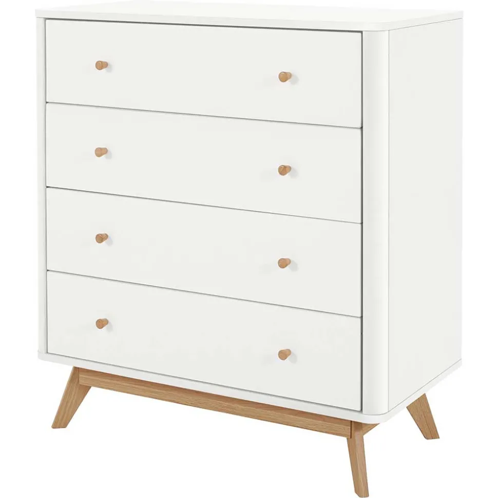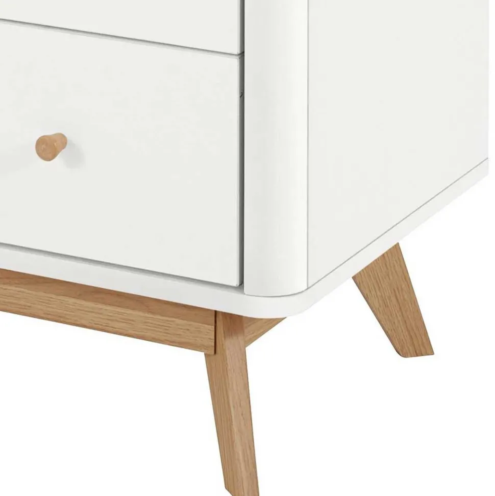 Gefertigt aus robustem Holzwerkstoff, überzeugt die Kommode mit pflegeleicht folierten Oberflächen in Weiß und Naturholzoptik. Die sanften Farbtöne unterstreichen den typischen Skandi-Stil, der für klare Linien und eine zeitlose Ästhetik steht.