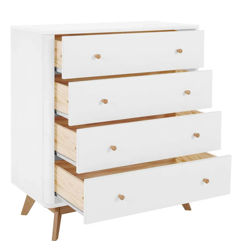 Mit vier geräumigen Schubladen bietet die Kommode reichlich Platz für Kleidung, Dokumente oder Alltagsgegenstände. Die Schubladen sind mit Metallauszügen ausgestattet, die ein komfortables Öffnen und Schließen ermöglichen. Runde Holz-Knopfgriffe ergänzen die moderne Gestaltung und sorgen für eine angenehme Haptik.
