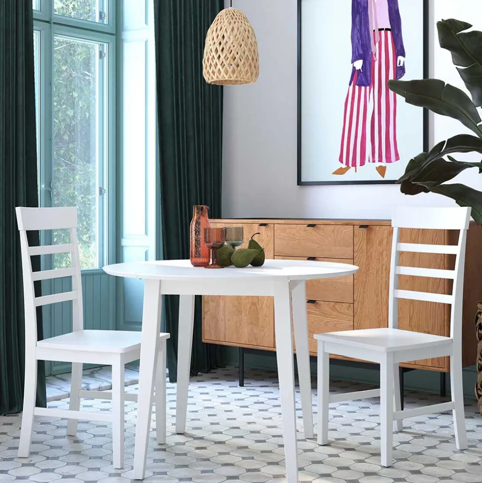 Der Tisch mit den Maßen 99x75x99 cm besticht durch seine abklappbaren Seiten, was besonders praktisch ist, wenn Sie mehr Platz benötigen. Das Fußgestell aus massivem Holz verleiht dem Tisch Stabilität und eine charmante Ausstrahlung.