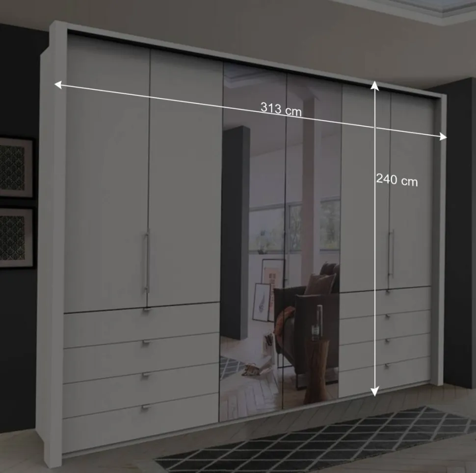 Mit beeindruckenden Maßen von 300 cm Breite, 236 cm Höhe und einer Tiefe von 58 cm liefert „Donpiave“ nicht nur optisch, sondern auch in Sachen Stauraum Großes. Die drei Panorama-Falttüren, mit ihrer Sechs-Türen-Optik, bieten einen leichten Zugang zu Ihrem gesamten Kleidersortiment, ohne dabei wertvollen Platz in Ihrem Raum zu beanspruchen. Die mittleren Türfronten zieren praktische Ganzkörperspiegel aus Parsol-Bronze, die das Zimmer optisch vergrößern und eine elegante Note hinzufügen.