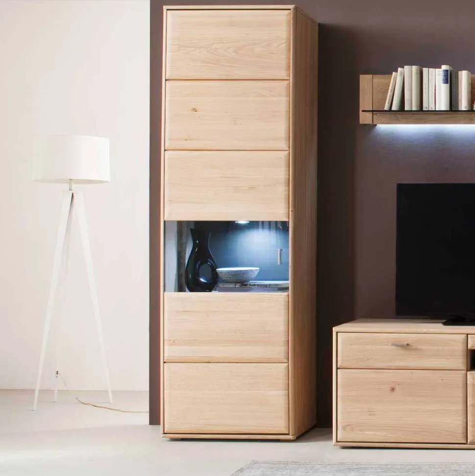 Der Korpus der Vitrine ist in Eiche Bianco furniert und geölt, was die Eleganz des Designs unterstreicht. Die Böden und die Rückwand sind in attraktiver Holzoptik foliert. Abgerundete Kanten des Korpus verleihen der Vitrine einen weichen, modernen Look, der dennoch von der Solidität und Robustheit des Designs zeugt.