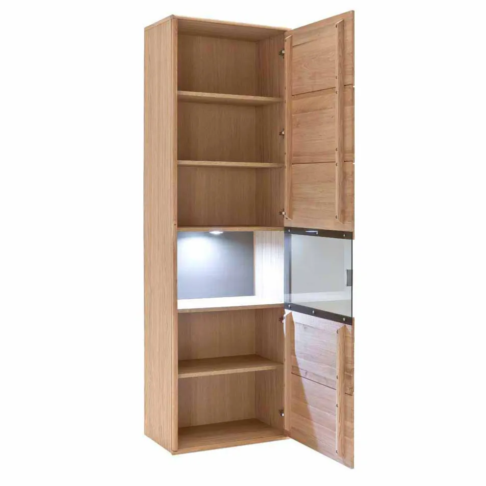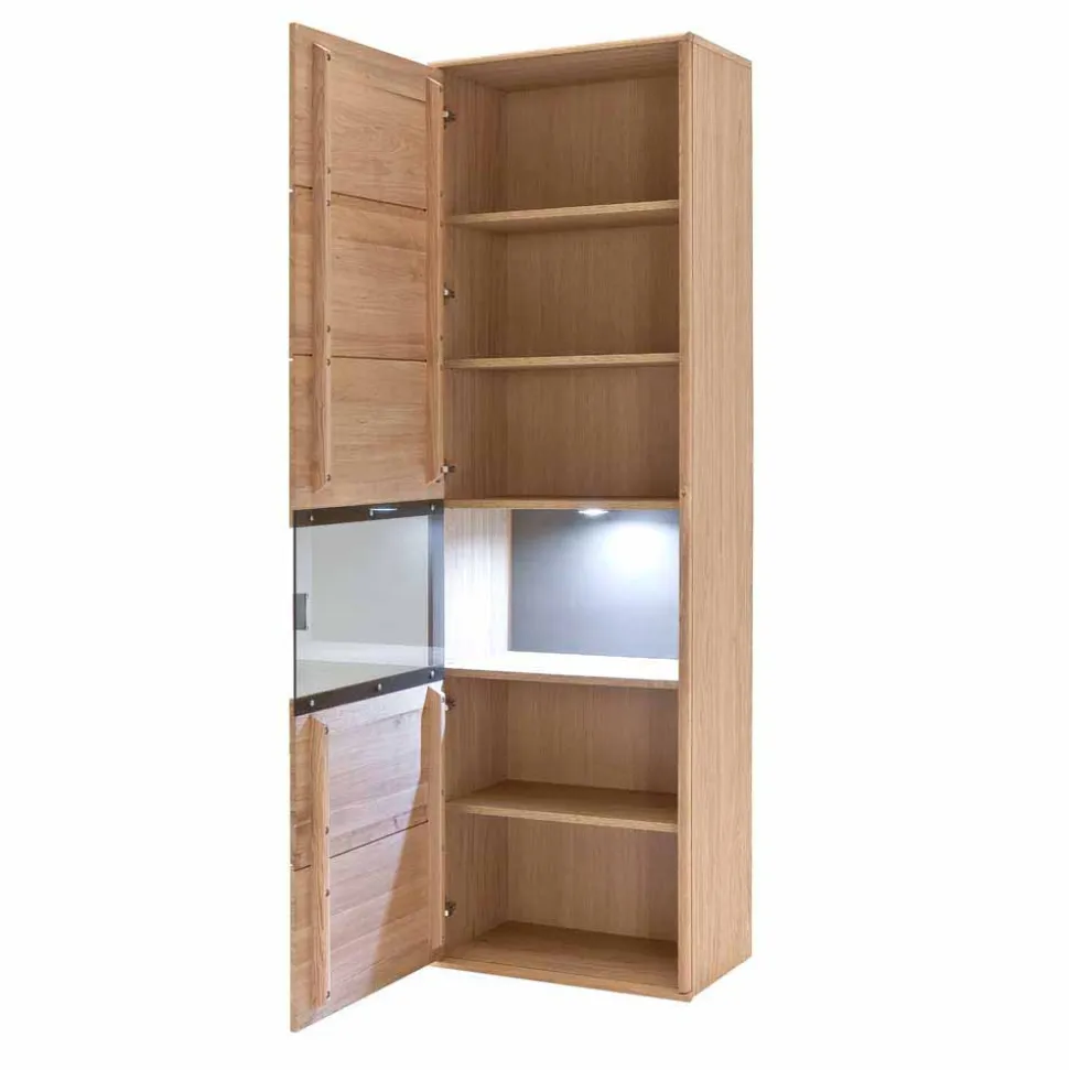 Die „Vernella“ Standvitrine ist ein eindrucksvolles Möbelstück mit einer Front aus massiver Eiche. Eiche ist ein besonders hartes, aber dennoch elastisches Holz, bekannt für seine hohe Dichte und Stabilität. Diese Eigenschaften garantieren eine ausgezeichnete Langlebigkeit und Beständigkeit gegen täglichen Verschleiß. Der warme und natürliche Farbton der Eiche sorgt dabei für ein gemütliches und einladendes Ambiente.