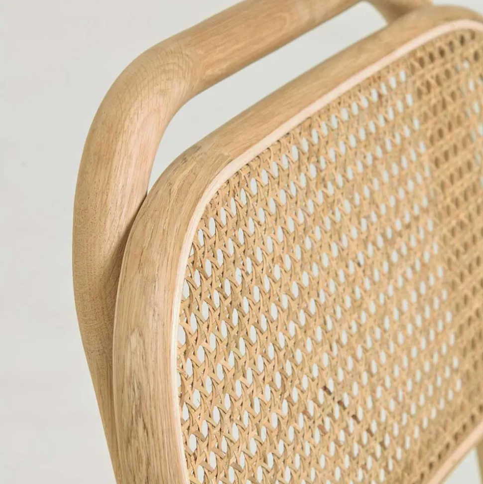 Die ovale Rückenlehne mit feinem Rattangeflecht im traditionellen Wiener Geflecht verleiht dem Stuhl einen Hauch Nostalgie und Leichtigkeit. Dieses filigrane Muster aus Naturfasern, bekannt aus den legendären Kaffeehäusern Wiens, verbindet luftige Eleganz mit angenehmem Halt im Rücken. Es ist nicht nur ein echter Blickfang, sondern sorgt auch für eine hervorragende Klimaregulierung beim Sitzen.