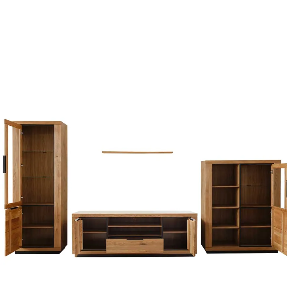 Mit ihrer warmen Wildeichefarbe und den kontrastierenden schwarzen Akzenten bringt die Wohnwand „Vlacoma“ ein angenehmes und gleichzeitig edles Ambiente in Ihr Zuhause. Die natürlich geölte Holzoberfläche mit durchgehenden Lamellen verleiht den Möbelstücken eine besonders hochwertige Optik und Haptik. Die Kombination aus Massivholz, MDF in Holzoptik foliert und Klarglas sorgt nicht nur für Stabilität und Langlebigkeit, sondern auch für eine ansprechende ästhetische Wirkung. Massivholz überzeugt durch seine Robustheit und natürliche Maserung, während MDF als Trägermaterial für die Holzoptik-Folie eine gleichmäßige Struktur bietet. Klarglas-Elemente runden das moderne Design ab und schaffen zusätzliche Leichtigkeit.