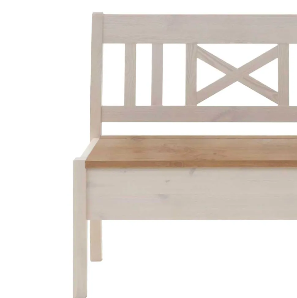 Entdecken Sie die Truhenbank Lugon – Ihre praktische Sitzgelegenheit, die bezaubernden Landhausflair in jeden Wohnraum bringt. Der attraktive Farbkontrast aus strahlendem Weiß und warmem Kiefer Laugenfarbig verleiht Ihrem Zuhause eine einladende und gemütliche Atmosphäre.