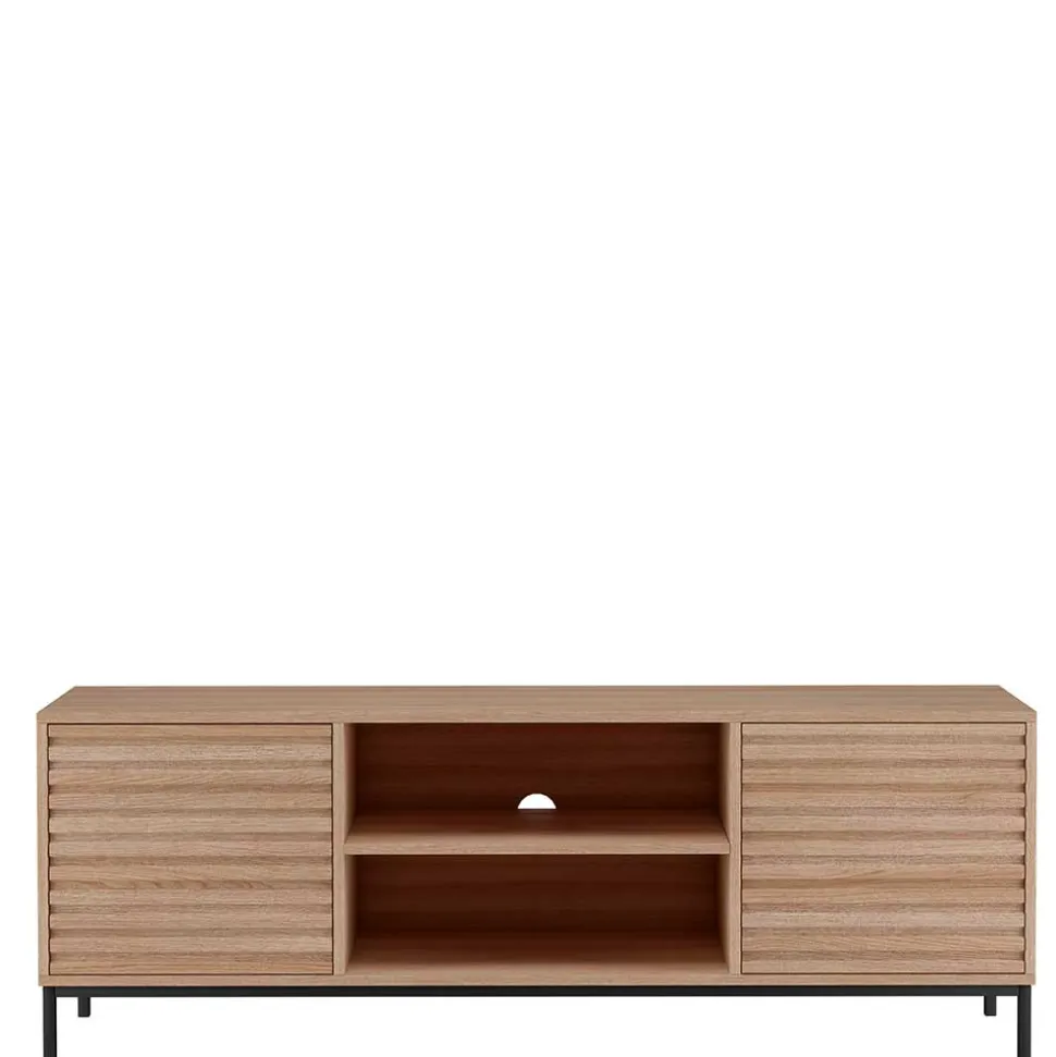 Mit einer Breite von 140 cm, einer Höhe von 50 cm und einer Tiefe von 40 cm bietet das Lowboard eine großzügige Stellfläche für Fernseher und Zubehör, ohne dabei zu wuchtig zu wirken. Die dekorativ gerillten Türfronten setzen stilvolle Akzente und verleihen dem Möbelstück einen unverwechselbaren Charakter.
