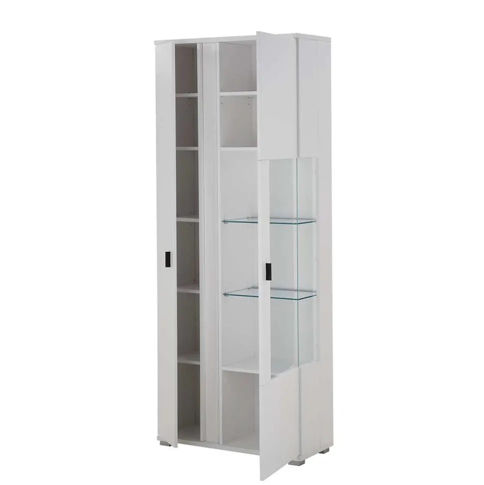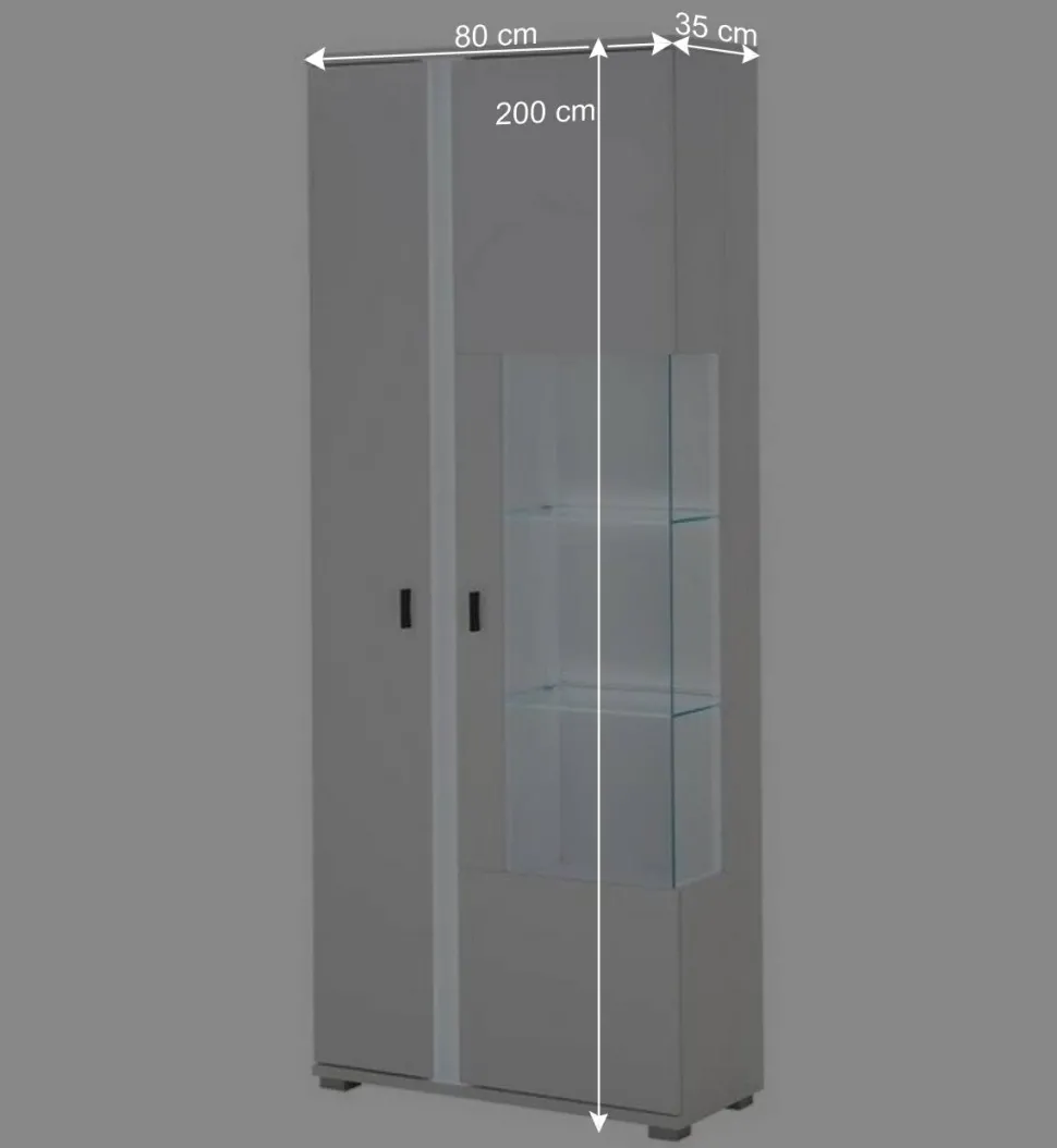 - Die Vitrine (80x200x35 cm): Ein eleganter Blickfang mit vielseitigen Nutzungsmöglichkeiten. Der Glaseinsatz, der sich rechts über Eck zieht, bringt Ihre schönsten Accessoires ins richtige Licht. Innen überzeugt die Vitrine mit fünf Einlegeböden auf der linken Seite sowie zwei Glasböden, zwei Konstruktionsböden und einem weiteren Einlegeboden auf der rechten Seite. Hier finden Bücher, Deko, Gläser oder Sammlerstücke ihren perfekten Platz.