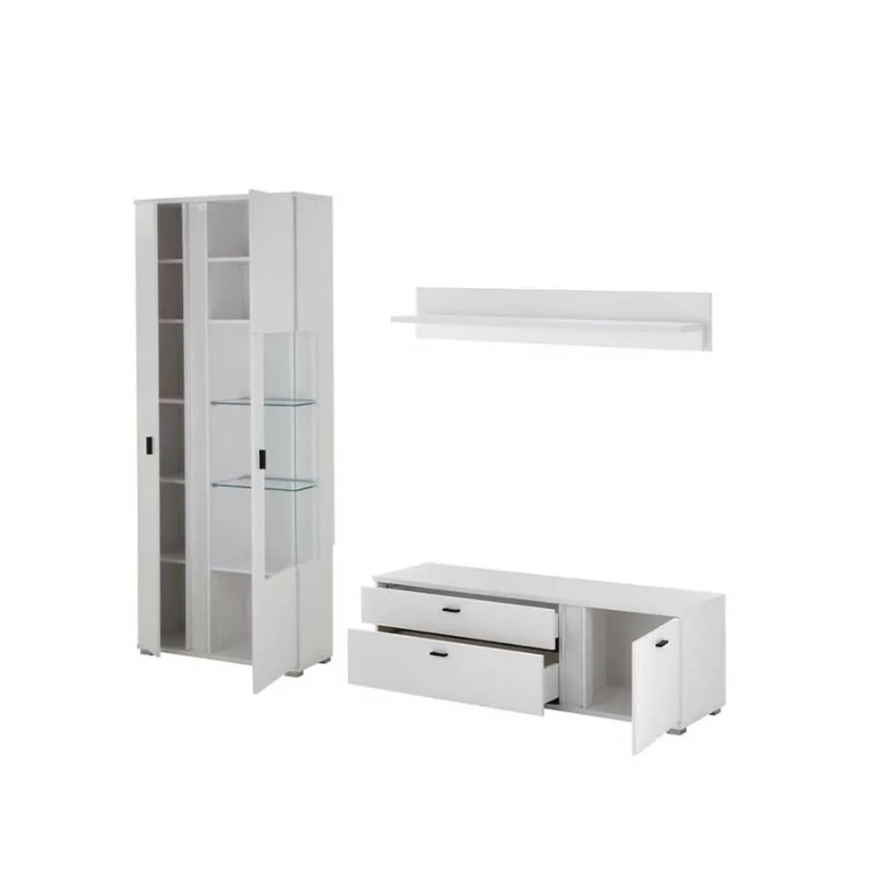 Eine stilvolle Wohnwand, die Ihr Wohnzimmer nicht nur verschönert, sondern auch Ihre Anforderungen an Funktionalität erfüllt, wird mit der TV Wohnwand Tirol Realität. Das moderne Design in strahlendem Weiß wird durch kontrastreiche schwarze Metall-Griffleisten ergänzt und zieht alle Blicke auf sich. Diese edle Farbkombination verleiht jedem Raum ein harmonisches und hochwertiges Ambiente. Klare Linien und ein puristischer Stil machen die Wohnwand zum zeitlosen Highlight, das sich in jeden modernen Einrichtungsstil perfekt einfügt.