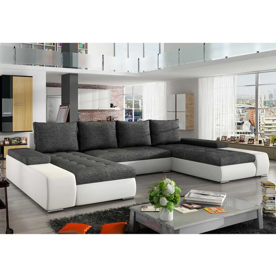 Die exklusive zweifarbige Optik aus dunkelgrauem Webstoff (100 % Polyester) und weißem Kunstleder (100 % Polyurethan) setzt stilvolle Akzente in Ihrem Wohnzimmer. Dabei überzeugt der Webstoff-Bezug durch seine robuste und pflegeleichte Beschaffenheit sowie eine angenehme, hautfreundliche Oberfläche. Das hochwertige Kunstleder ergänzt diesen Look perfekt und ist ebenfalls besonders strapazierfähig sowie leicht zu reinigen. Die aufwendig gesteppten Sitzflächen runden das elegante Erscheinungsbild ab und geben der Wohnlandschaft eine besonders hochwertige Optik.