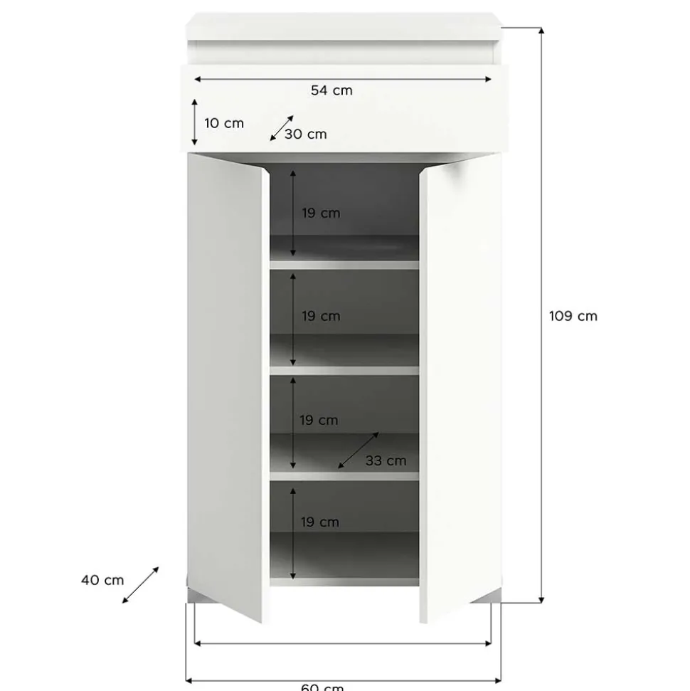 Mit einer Breite von 60 cm, einer Höhe von 109 cm und einer Tiefe von 40 cm bietet der Schuhschrank „Suad“ ausreichend Platz für Ihre Schuhsammlung. Hinter den zwei Türen, die mit stabilen Metallbeschlägen ausgestattet sind, finden Sie drei Einlegeböden, die Platz für etwa acht Paar Schuhe bieten. Diese Metallbeschläge garantieren eine lange Lebensdauer und sorgen dafür, dass die Türen auch nach vielen Jahren noch einwandfrei schließen. Oberhalb der Türen befindet sich eine praktische Schublade mit Metallauszug, die zusätzlichen Stauraum für Kleinigkeiten wie Schuhpflegeprodukte oder Accessoires bietet. Dank des hochwertigen Metallauszugs lässt sich die Schublade leicht und geräuschlos öffnen und schließen.