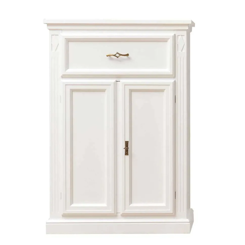 Mit seinem klassischen Design und der edlen weißen Lackierung ist das Vertiko „Eli“ eine geschmackvolle Ergänzung für Ihr Zuhause. Die schlichte Eleganz kombiniert mit kunstvollen Details verleiht diesem Möbelstück Charme und Charakter. Perfekt geeignet, um stilvoll Ordnung zu schaffen und gleichzeitig einen dekorativen Akzent zu setzen.