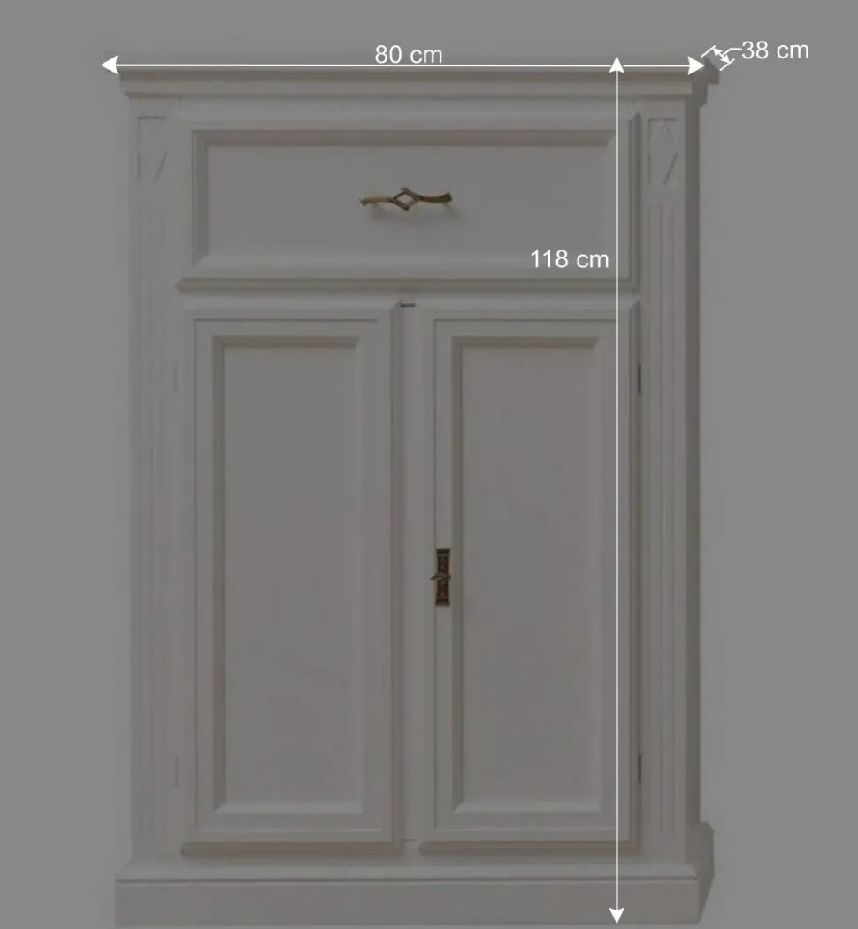 Das Vertiko wird fertig montiert geliefert – lediglich kleinere Anbauteile müssen eventuell noch angebracht werden. Mit seinen kompakten Maßen von 80 cm Breite, 118 cm Höhe und 38 cm Tiefe eignet es sich perfekt für verschiedenste Wohnbereiche.