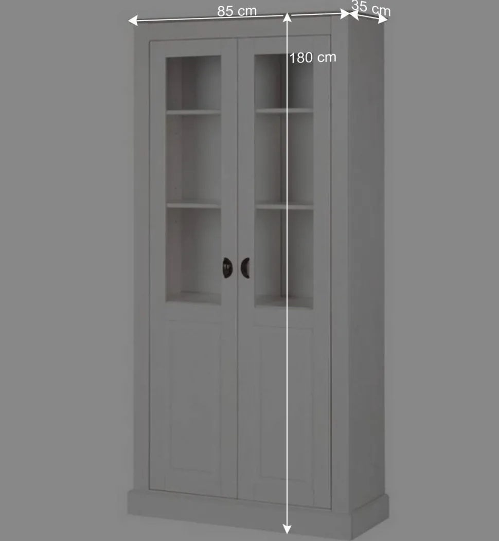 Gefertigt aus hochwertigem Kiefer-Massivholz, steht dieser Vitrinenschrank für Stabilität und Wertigkeit. Die pflegeleicht lackierten Oberflächen gewährleisten eine einfache Reinigung und erhalten dauerhaft das makellose Erscheinungsbild. Besonders edel wirkt die grau abgesetzte Deckplatte, die einen stilvollen Akzent setzt. Die handlichen Metall-Muschelgriffe in Altsilberfarben runden das Gesamtbild gekonnt ab.