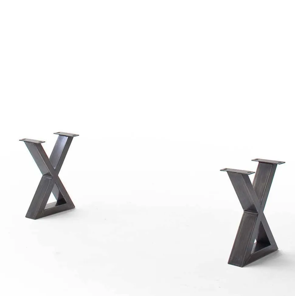 Die stilvollen X-Beine aus Metall ergänzen das Design perfekt und bieten eine stabile Grundlage. Die Beine sind in einem Antik-Look gewischt und in Altsilber gehalten, was einen attraktiven Kontrast zum naturbelassenen Holz schafft. Diese durchgehende Bodenauflage sorgt für zusätzliche Stabilität und verleiht der Bank einen robusten, industriellen Touch.