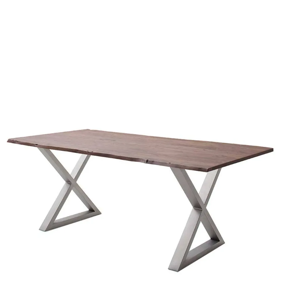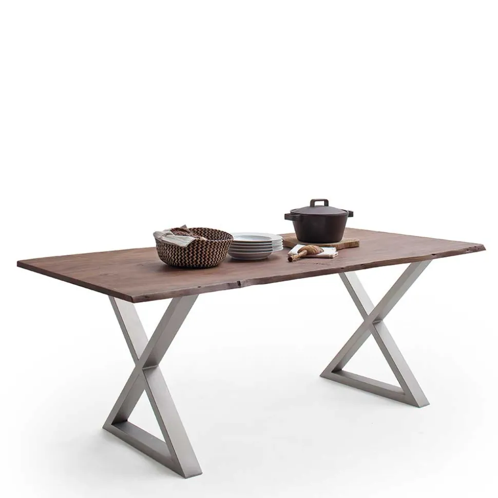 Der Waldkantentisch „Bekunion“ ist der perfekte Blickfang für einen gemütlichen Essbereich und vereint natürlichen Charme mit moderner Eleganz. In stilvollem Walnuss Braun und Edelstahl gehalten, fügt sich dieser Tisch harmonisch in jede moderne Einrichtung ein und sorgt für ein einladendes Ambiente.
