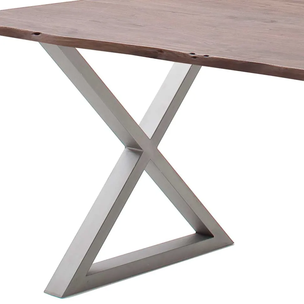 Ein Highlight des Waldkantentisches „Bekunion“ sind die einzigartigen Naturkanten an den Längsseiten der Tischplatte. Diese Kanten werden direkt aus dem Stamm geschnitten und verleihen jedem Tisch eine individuelle Note. Die solide Tischplatte hat eine Stärke von etwa 2,5 cm und bietet eine robuste und stabile Oberfläche. Das stylische Gestell besteht aus zwei X-förmigen Elementen mit breiter Bodenauflage, die für einen sicheren Stand sorgen und gleichzeitig ein optisches Highlight setzen.