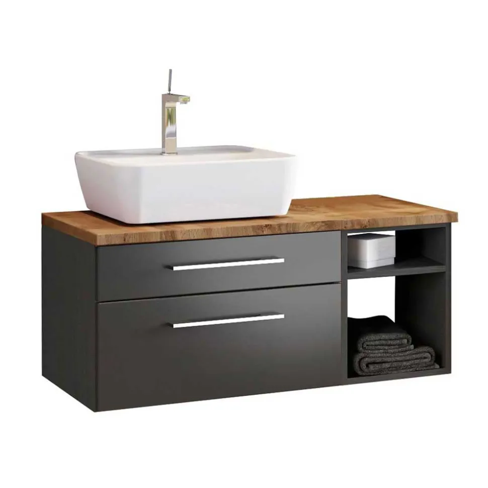 Geradlinige Formen, klare Strukturen und die harmonische Kombination aus dunkelgrauen Flächen und dem warmen Holzdekor in Wildeiche prägen den zeitgemäßen Charakter dieses Waschplatzes. Modernes Design bedeutet hier nicht nur eine attraktive Optik, sondern auch durchdachte Funktionalität – perfekt abgestimmt auf die Bedürfnisse des Alltags. Die dunkle Farbgebung verleiht dem Set eine edle Ausstrahlung, während die holzfarbene Deckplatte natürliche Wärme ins Bad bringt.