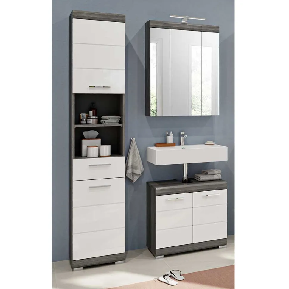 Die attraktiven Farbtöne Weiß und Rauchgrau sorgen für einen zeitlosen Look, der sowohl in helle als auch in dunklere Badräume hervorragend passt. Die weißen Fronten in Hochglanzoptik mit elegantem Rillendekor verleihen dem Ensemble einen edlen Touch. Dazu bilden die rauchgrauen Oberflächen in realistischer Holzoptik einen stilvollen Kontrast.