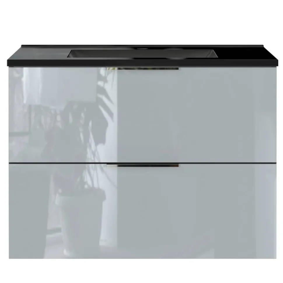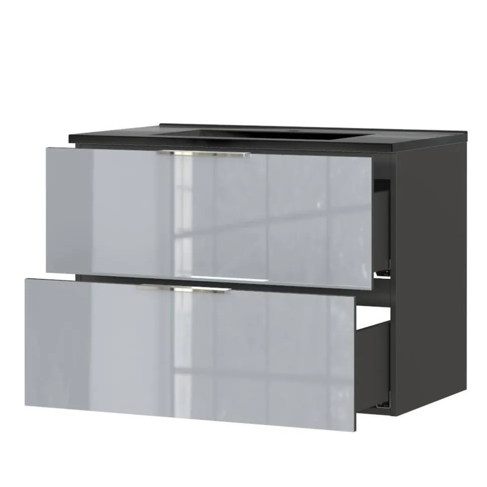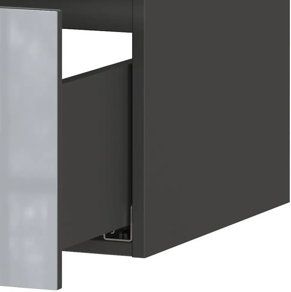 Gefertigt aus robuster Spanplatte bietet der Waschtisch eine solide Basis für den täglichen Gebrauch. Die dunkle, melaminbeschichtete Oberfläche ist besonders widerstandsfähig gegen Feuchtigkeit und Kratzer, während die silbergraue, glasbeschichtete Front einen edlen Glanz verleiht. Chromfarbene Metallgriffe setzen dezente Akzente, und die stoßfesten ABS-Kanten sorgen für eine erhöhte Langlebigkeit.