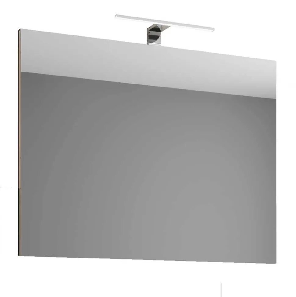 Der rahmenlose Spiegel, dessen Rand dezent in Holzoptik beschichtet ist, fügt sich nahtlos in das Gesamtbild ein. Je nach gewählter Größe misst er 60x40x2 cm oder 80x40x2 cm. Durch die im Lieferumfang enthaltene LED-Aufsatzleuchte wird das Spiegelbild optimal ausgeleuchtet – ideal für den perfekten Start in den Tag. Bitte beachten Sie, dass sich mit montierter Leuchte die Gesamthöhe leicht verändert.