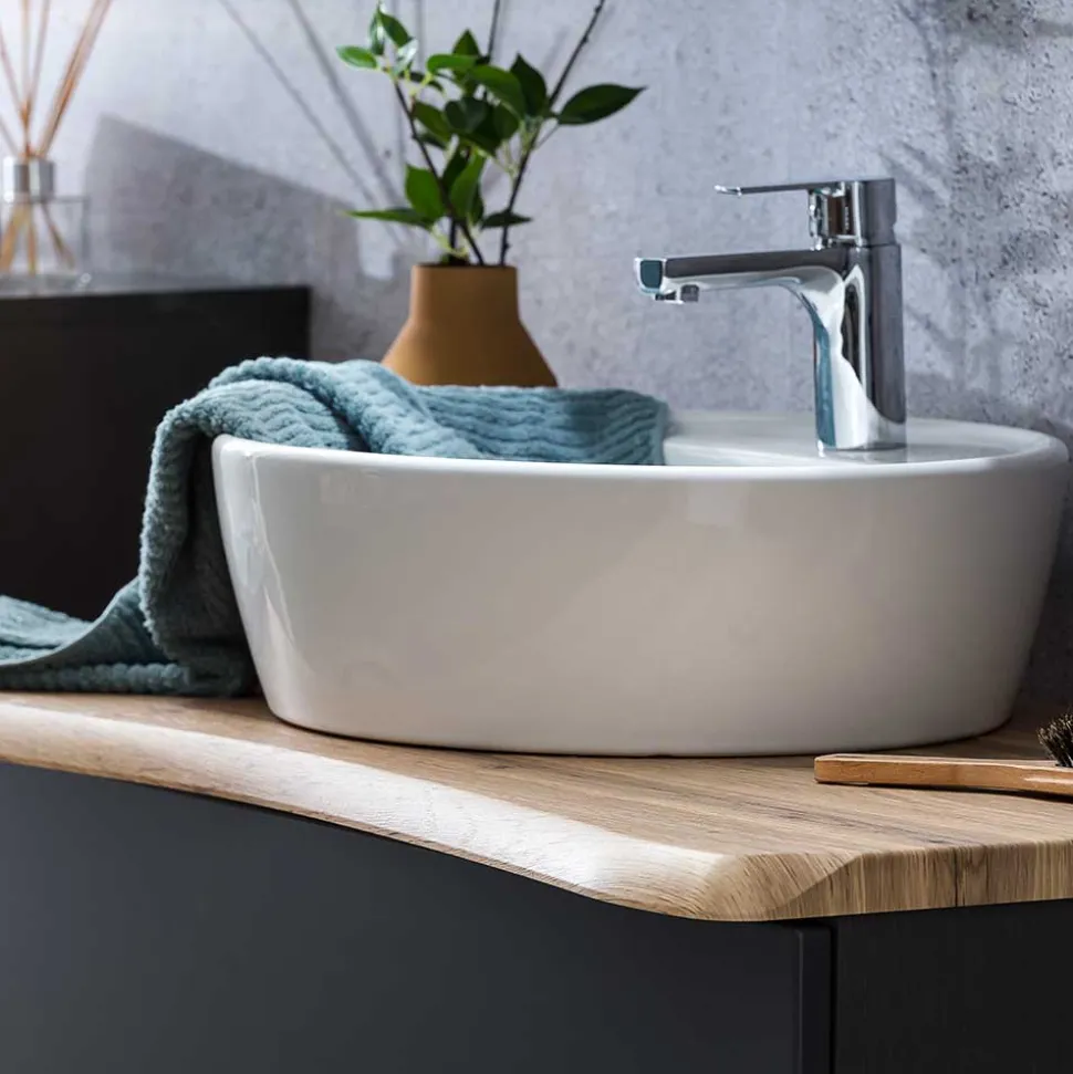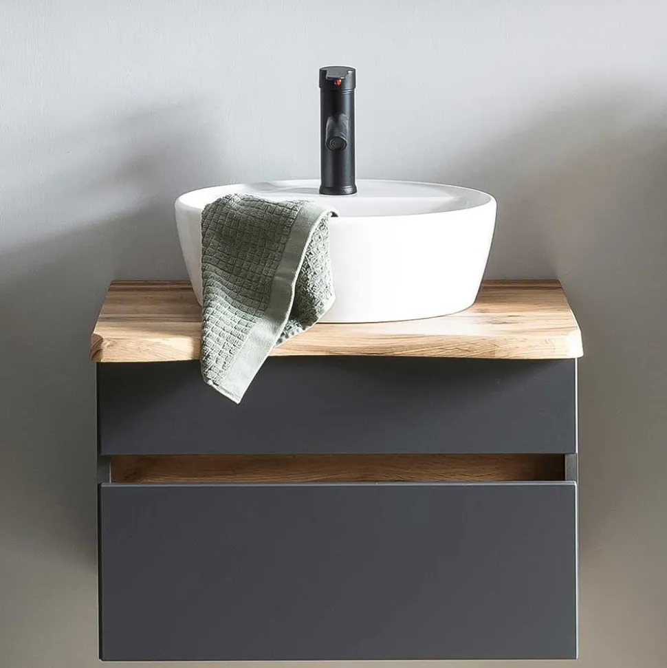 - Trendstarker Waschtisch mit Baumkante in Dunkelgrau und Wildeichefarben