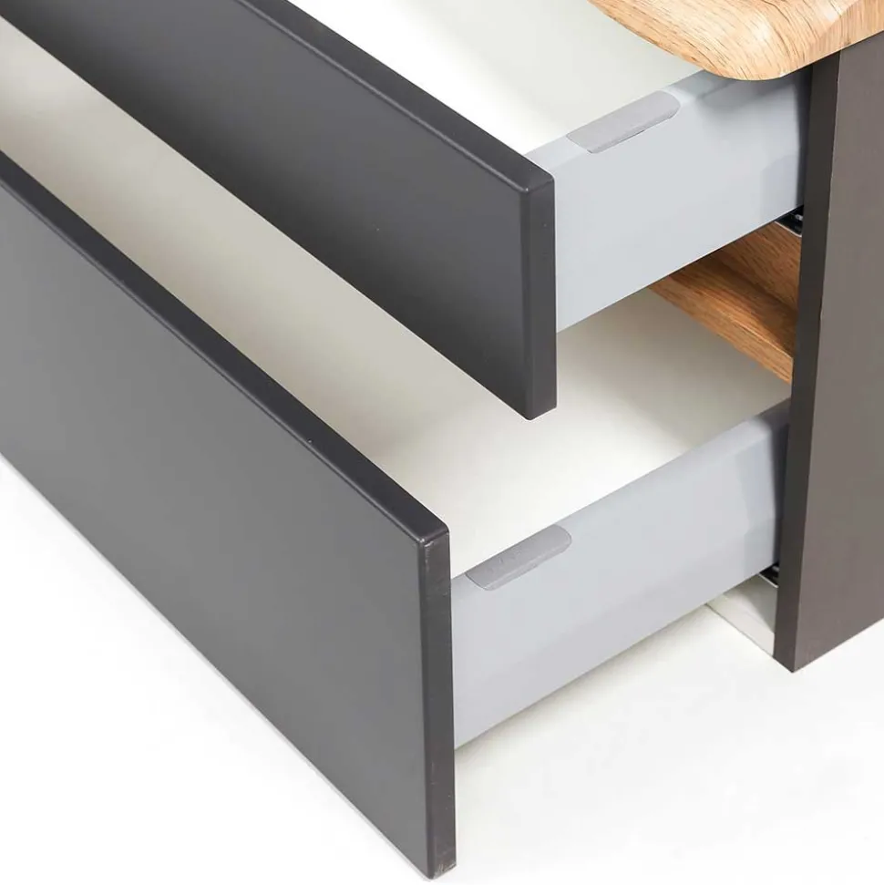 Mit ihrem charakteristischen Landhausdesign setzt die Konsole Agiruan auf zeitlose Behaglichkeit, ohne dabei auf moderne Akzente zu verzichten. Die warme Holzoptik in Wildeiche mit Touchwood-Oberfläche verleiht dem Möbelstück eine natürliche Ausstrahlung, während das elegante Dunkelgrau der Fronten für einen stilvollen Kontrast sorgt. Besonders hervorzuheben ist die nachempfundene Baumkante an der Deckplatte – ein Detail, das echte Handwerkskunst vermittelt und den authentischen Look unterstreicht.