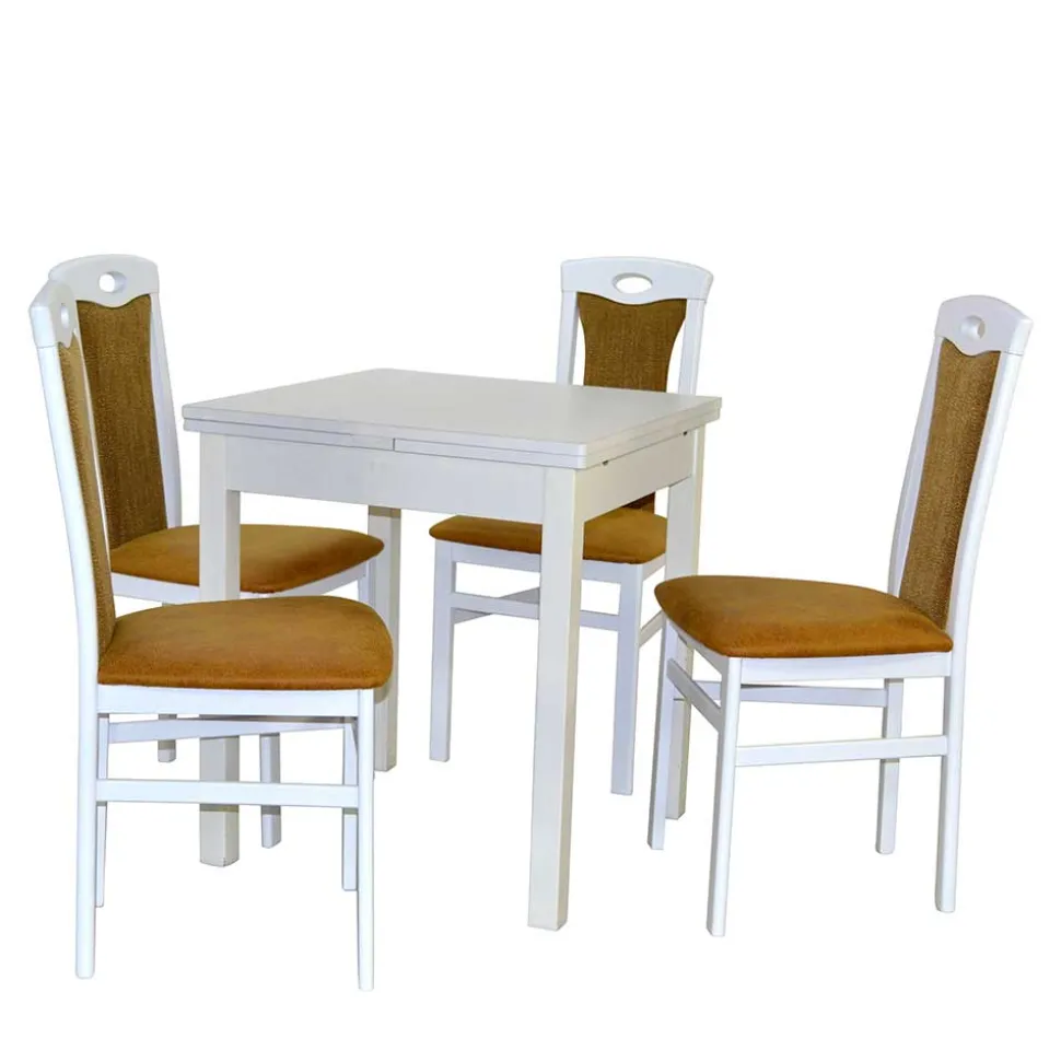 Vier formvollendete Stühle und ein geschmackvoll designter Tisch bilden gemeinsam die elegante Sitzgruppe „Calasso“. Ideal für den Essbereich, die Küche oder das Wohnzimmer, bietet dieses Set eine harmonische Kombination aus Design, Qualität und Alltagstauglichkeit. Das Zusammenspiel aus einem strahlenden Weiß und einem satten Ockergelb setzt dekorative Akzente und verleiht jedem Raum ein Gefühl von Wärme und klassischer Ästhetik.