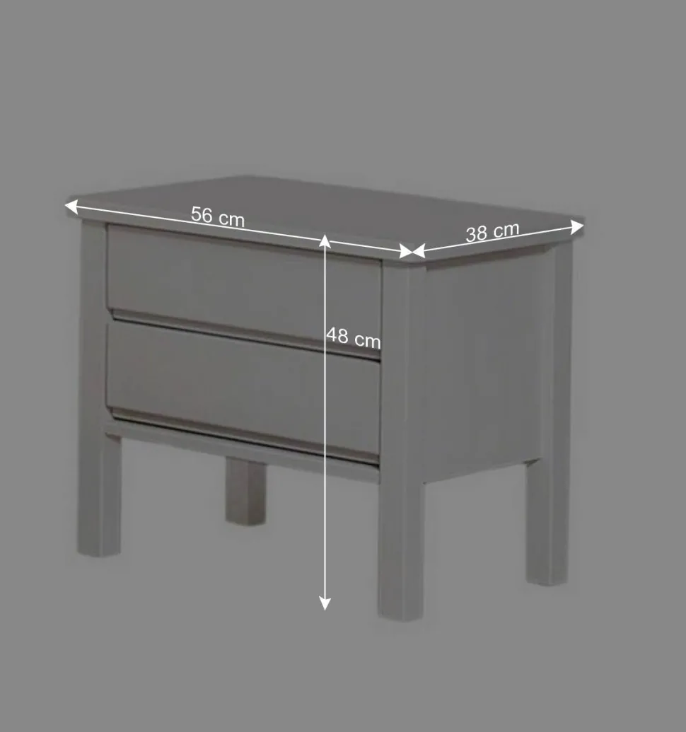Mit ihren großzügigen Maßen von 56 cm Breite, 48 cm Höhe und 38 cm Tiefe bietet die Kommode genügend Platz für all Ihre Habseligkeiten. Die zwei geräumigen Schubladen mit robustem Metallauszug sind leichtgängig und bieten ausreichend Stauraum für Bücher, Zeitschriften oder persönliche Gegenstände. Die praktischen Griffmulden ermöglichen ein müheloses Öffnen und Schließen der Schubladen – so haben Sie alles griffbereit, ohne auf Design und Eleganz verzichten zu müssen.