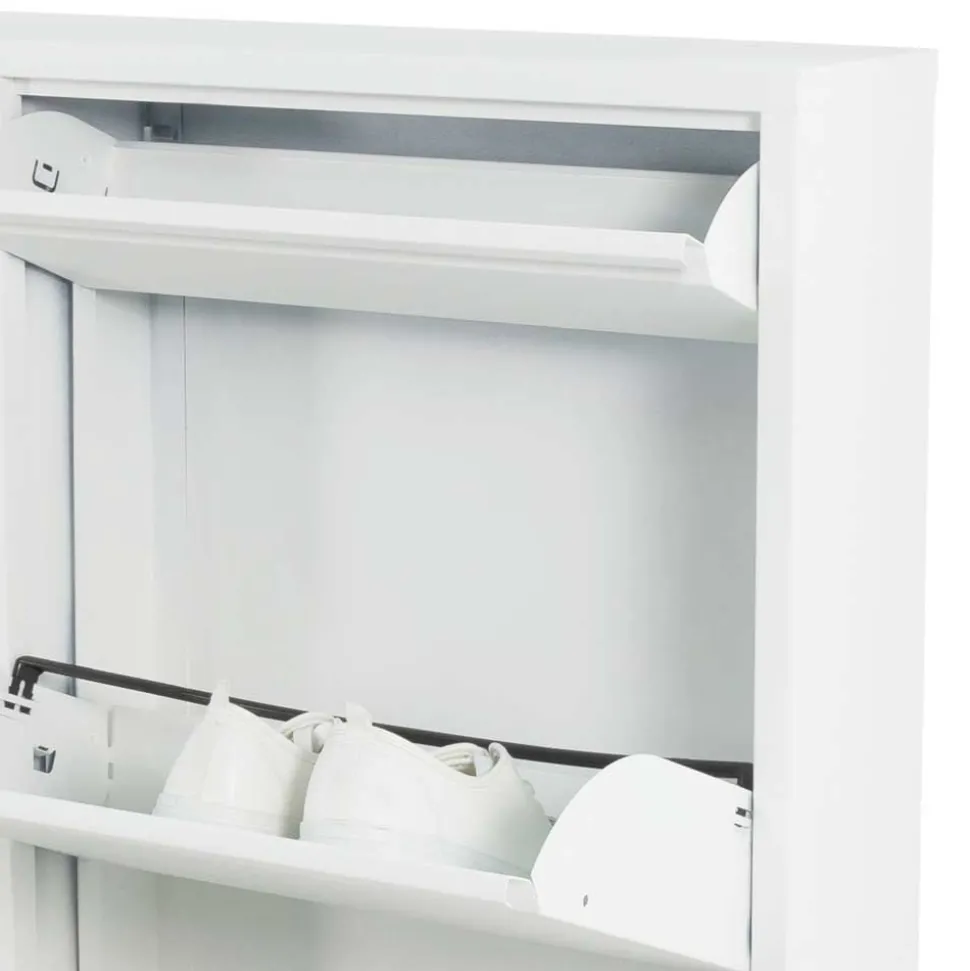 Mit nur 15 cm Tiefe gehört Cioara zu den schlanksten Vertretern seiner Art und bietet dennoch erstaunlich viel Stauraum. Die vier Klappen (je Seite synchron öffnend) nehmen bis zu acht Paar Schuhe auf – optimal für Alltagsschuhe ohne Absatz und geeignet bis Schuhgröße 44/45. Zwei zusätzliche Fächer an der Oberseite bieten Platz für Handschuhe, Schlüssel oder Accessoires, die stets griffbereit sein sollen.