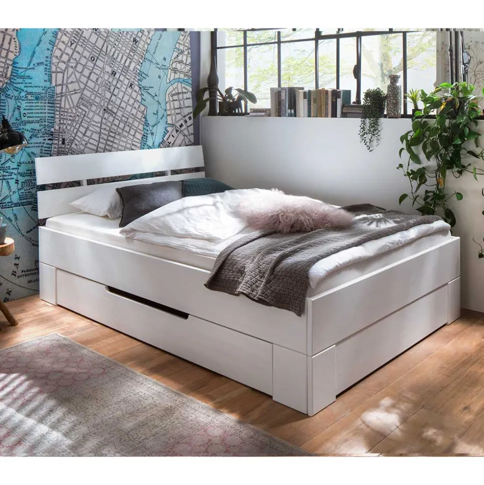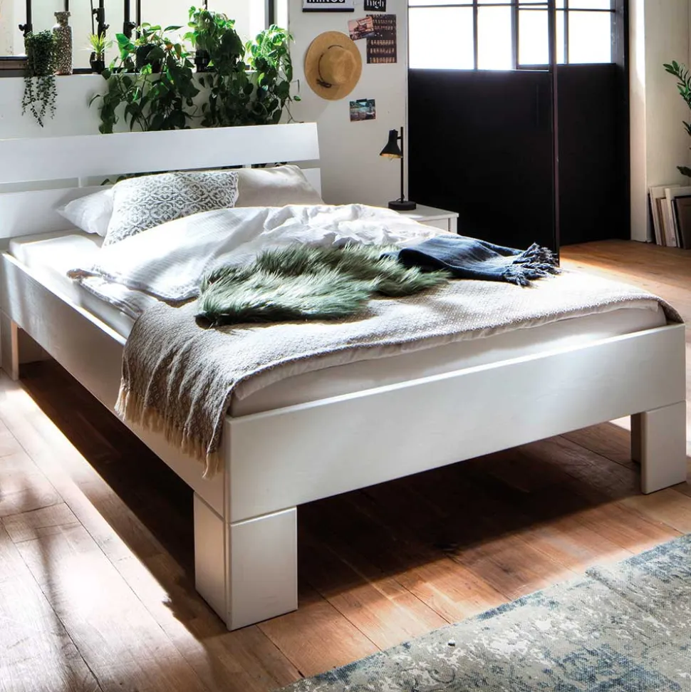 Einrichtungsliebhaber und Designenthusiasten aufgepasst: Das Bett „Snoudy“ fügt sich nahtlos in jedes moderne Schlafzimmer ein. Die klare Linienführung und die sanft weiß lackierten Oberflächen, durch die die natürliche Holzmaserung hindurchscheint, bringen einen Hauch von Natur in Ihr Zuhause. Diese Kombination verleiht dem Raum nicht nur ein ästhetisch ansprechendes Flair, sondern fördert auch ein angenehmes Raumklima.