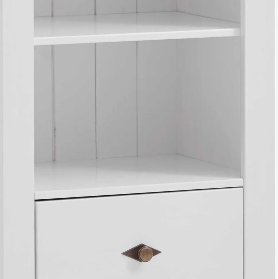 Die Oberflächen des Regals sind in einem strahlenden Weiß lackiert, wobei die durchscheinende Maserung des Holzes für einen Hauch von Natürlichkeit sorgt. Diese Lackierung bietet nicht nur Schutz, sondern unterstreicht auch die hochwertige Anmutung des Möbelstücks.