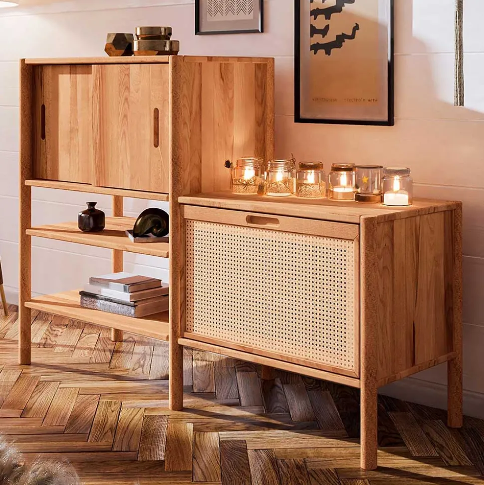 Das Stufenregal „Indrya“ begeistert durch seine Kombination aus massiver Wildbuche und Rattan, wodurch es eine besonders edle und warme Ausstrahlung erhält. Die Wildbuche, bekannt für ihre lebendige Maserung und ihre individuellen Farbnuancen, verleiht jedem Möbelstück einen einzigartigen Charakter. Jedes Regal wird somit zum Unikat.