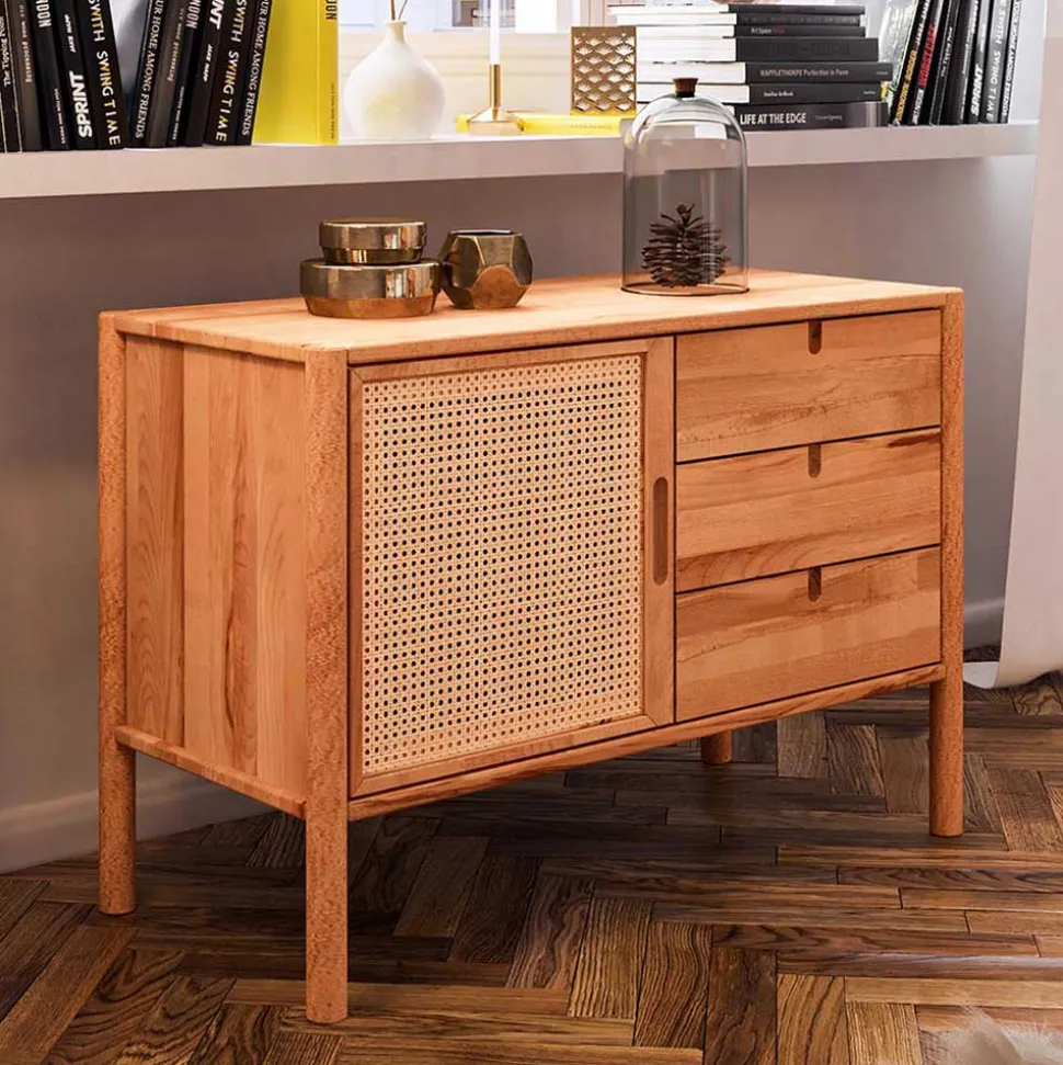 Eleganz und Funktionalität vereinen sich in der Kommode „Indrya“, die durch ihr modernes, natürliches Design überzeugt. Das Highlight dieses Möbelstücks ist die harmonische Verbindung aus massiver Wildbuche und Rattan, die Ihrem Wohnraum eine warme und zeitgemäße Atmosphäre verleiht.