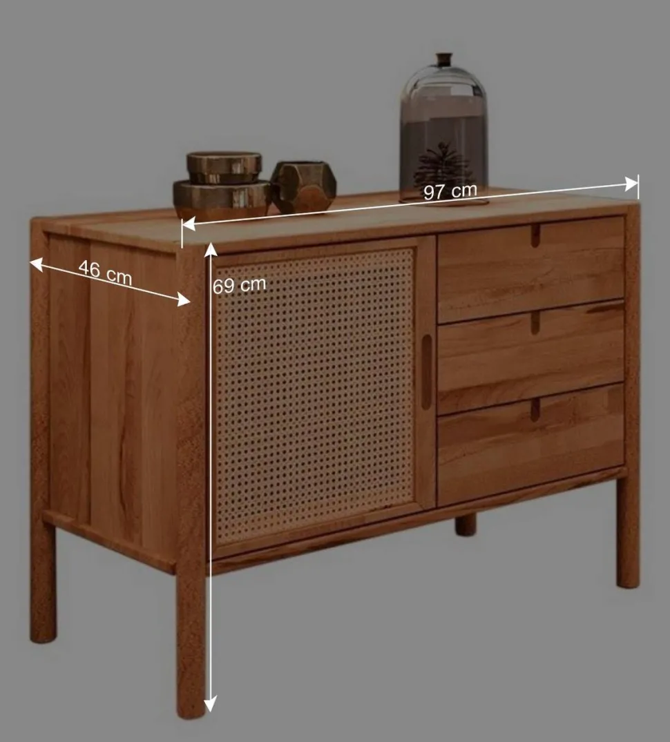 Die Maße von 97 cm Breite, 46 cm Tiefe sowie 69 cm in der Höhe bieten Ihnen reichlich Stauraum. Die Kommode verfügt über eine Tür mit gedämpften Metallbeschlägen, die für ein sanftes und leises Schließen sorgen. Besonders auffällig ist die Türfront im Stil des Wiener Geflechts, ein traditionelles Flechtmuster, das aus Rattan gefertigt ist und für eine luftige, dekorative Optik sorgt. Zusätzlich bieten drei Schubladen, ausgestattet mit einem Metallauszug und der praktischen Soft-Close Funktion, weiteren Platz. Diese Schubladen schließen sanft und leise, wobei ihre Innenhöhe von ca. 10 cm sich ideal für kleinere Gegenstände eignet.