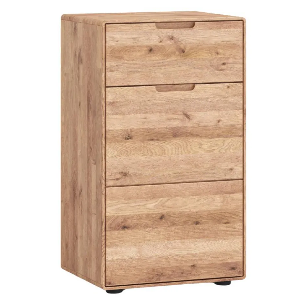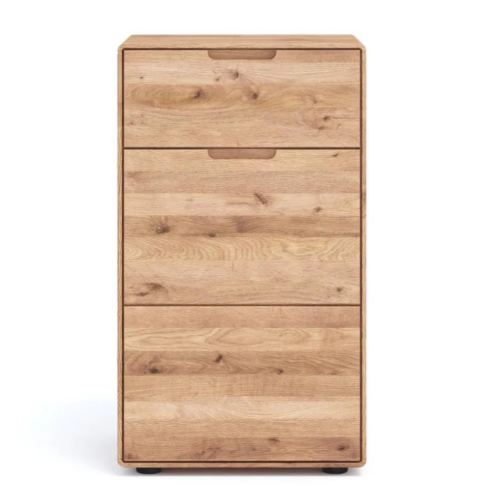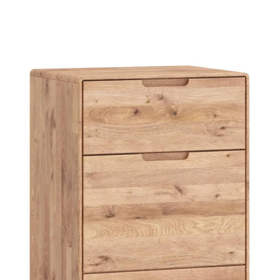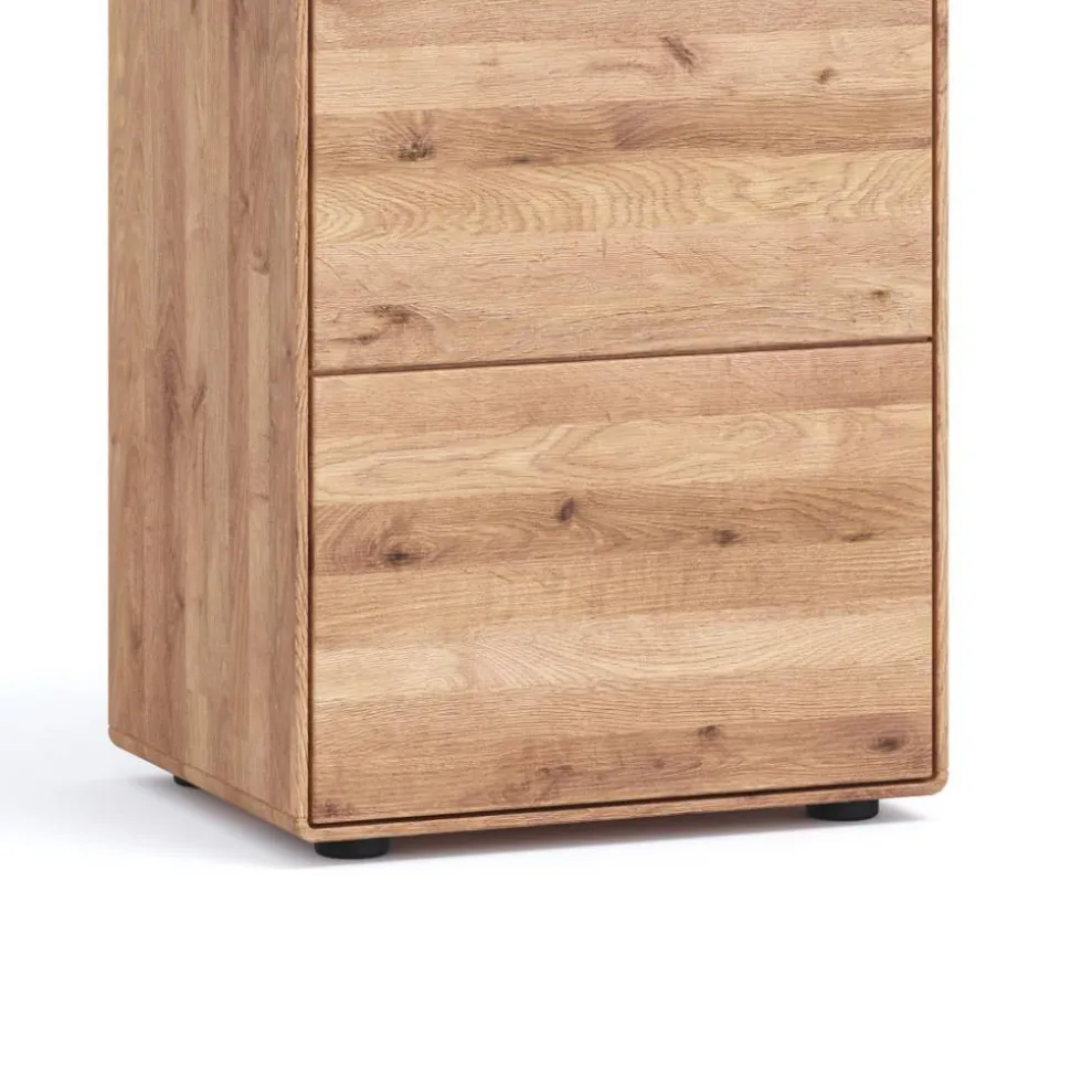 Die fein geölte Oberfläche bringt die lebendige Maserung der Wildeiche voll zur Geltung und sorgt für ein samtig-warmes Gefühl beim Berühren. Gleichzeitig schützt das Öl das Holz auf natürliche Weise und erhält seine Atmungsaktivität. Die Kommode strahlt so nicht nur optisch Natürlichkeit aus, sondern fühlt sich auch angenehm an – ein echtes Erlebnis für die Sinne.