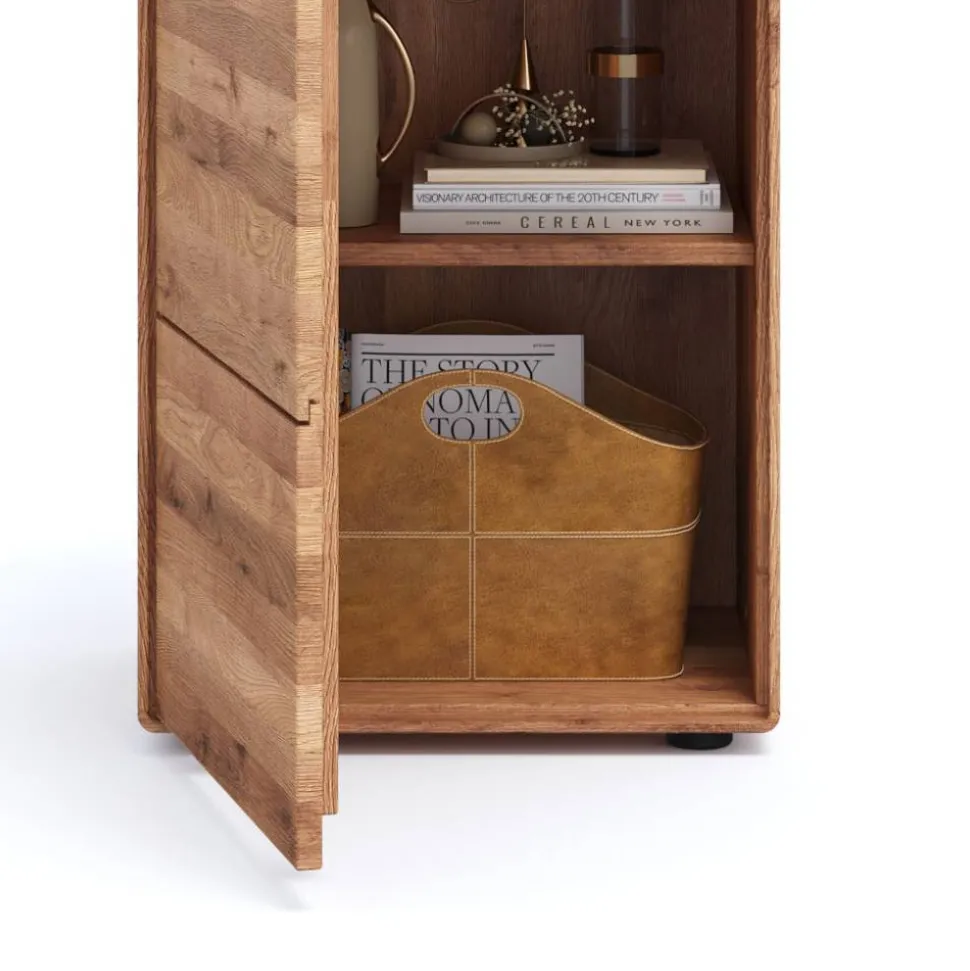 Gefertigt aus massivem Wildeichenholz bringt die Hochkommode nicht nur Stabilität, sondern auch eine warme, lebendige Ausstrahlung mit sich. Wildeiche zählt zu den edelsten Hölzern Europas – bekannt für ihre besondere Härte, ausgeprägte Maserung und charaktervolle Farbvariationen. Jedes Stück ist ein absolutes Unikat, geprägt vom natürlichen Spannungsfeld des Holzes, das sanfte Wölbungen und Risse mit sich bringen kann. Diese sind kein Mangel, sondern Ausdruck von Echtheit und Authentizität – wie bei einem wertvollen Kunstwerk.