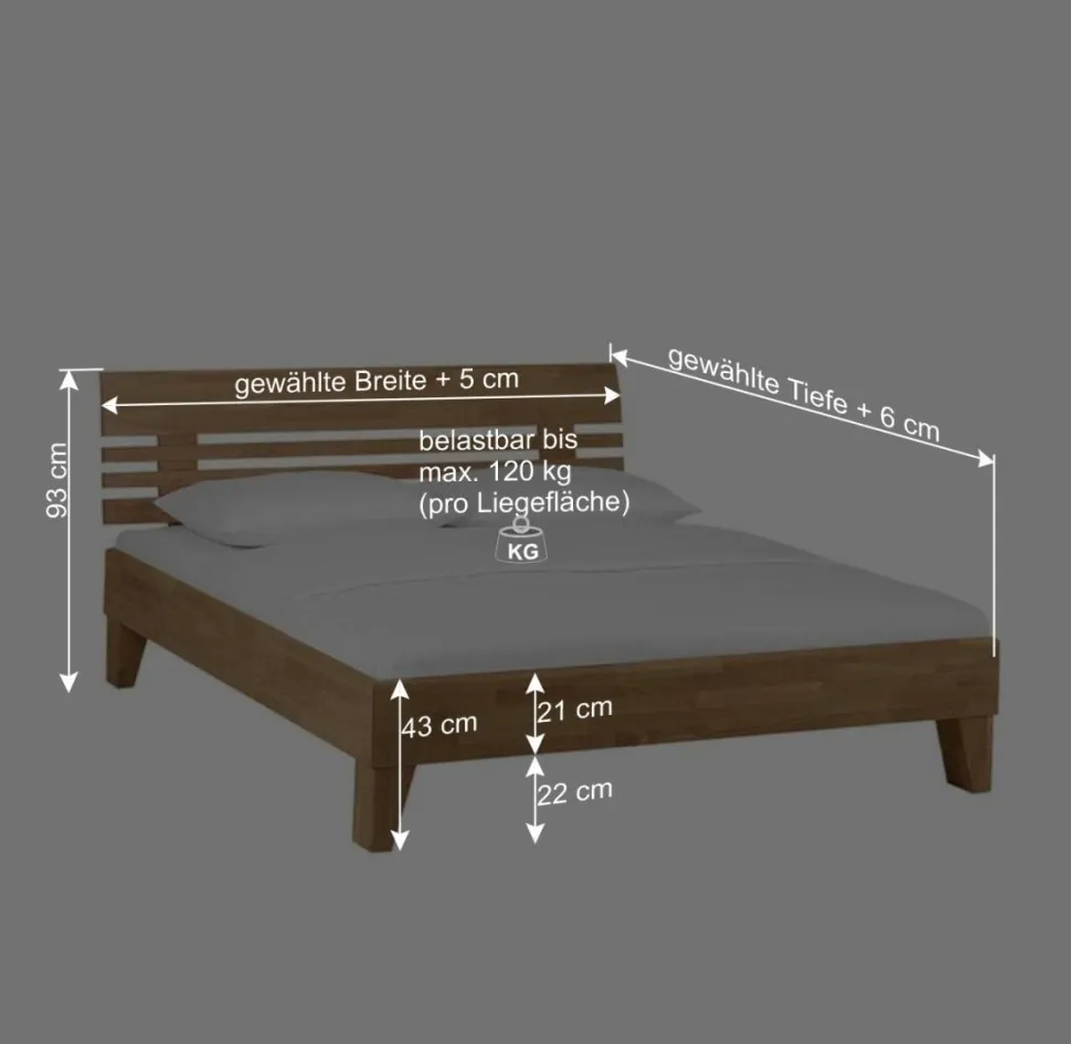 Unser Bett „Verinaros“ ist in verschiedenen Größen erhältlich, von 140×200 cm bis 180×220 cm, und bietet pro Liegefläche eine maximale Belastbarkeit von 120 kg. Dank des mitgelieferten Mittelstegs können Sie zwei Lattenroste bequem darauf platzieren, und die Einlegetiefe des Lattenrosts ist 4-fach verstellbar von 9,5 bis 17 cm. Die bequeme Einstiegshöhe von 42 cm ermöglicht Ihnen ein komfortables Ein- und Aussteigen.