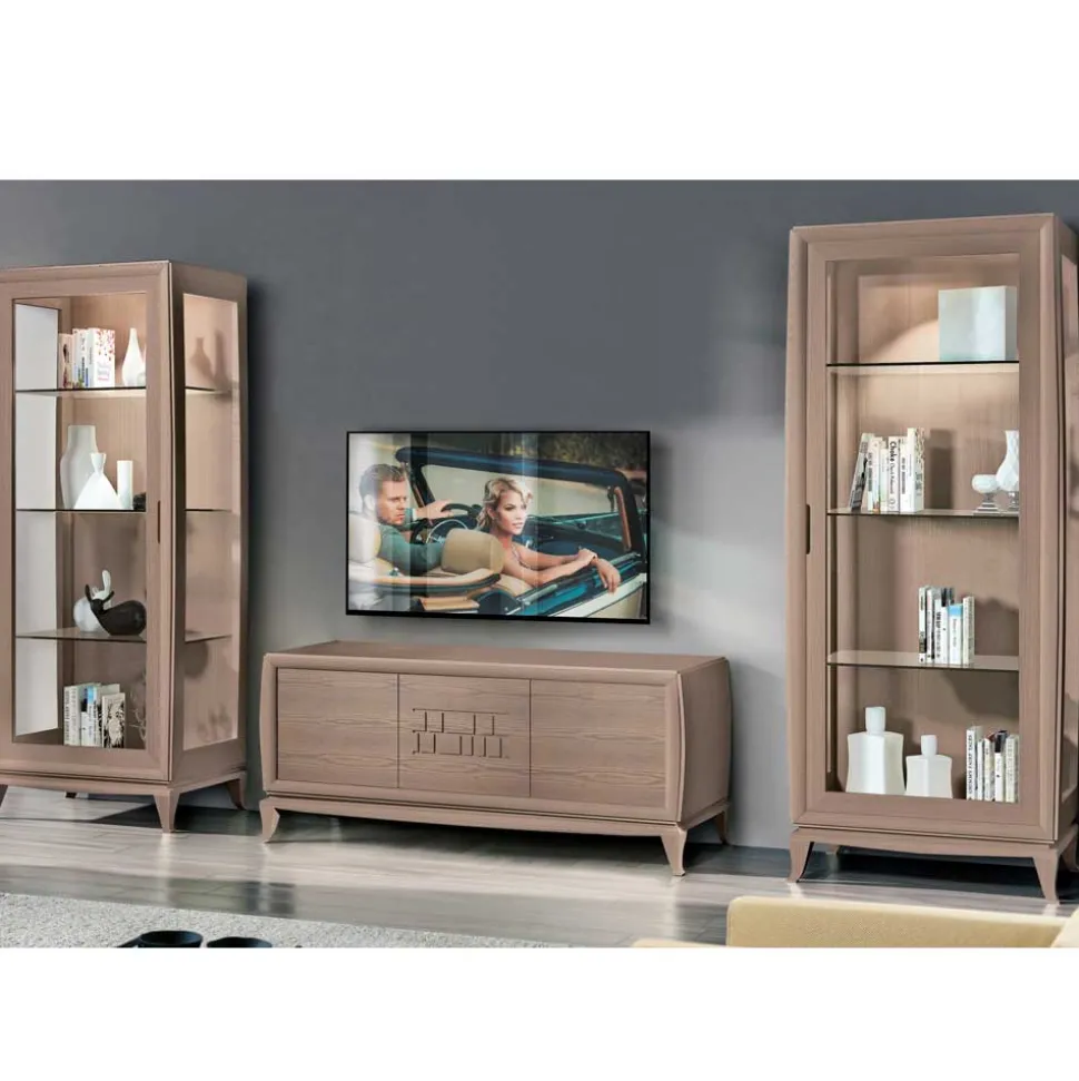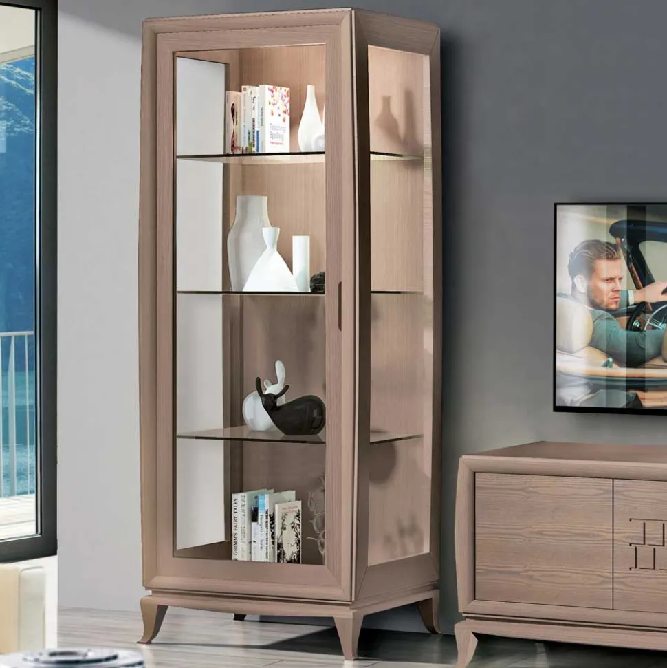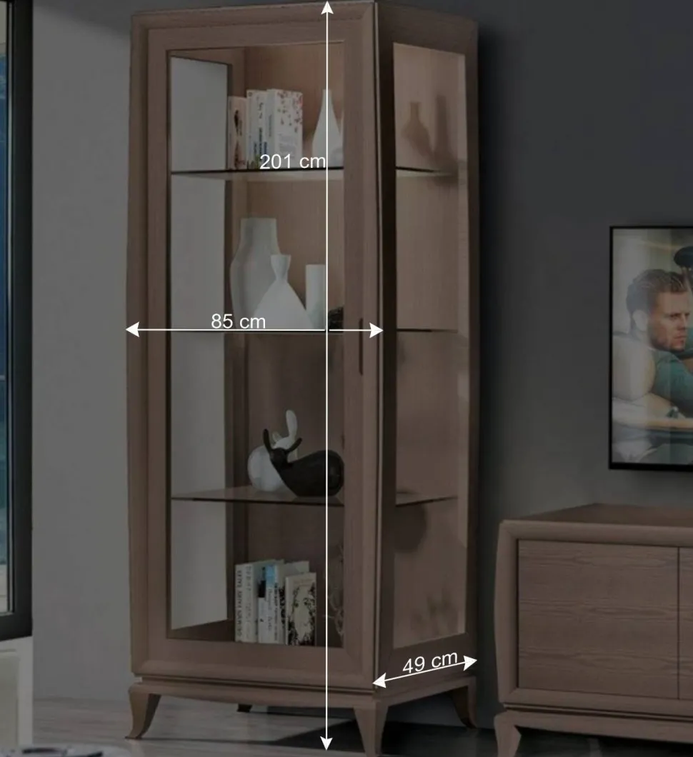 Die beiden Vitrinen, jeweils mit einer Höhe von 201 cm und einer Breite von 85 cm, bieten eine beeindruckende Mischung aus Stauraum und Ausstellungsfläche. Eine mit Rechts- und eine mit Linksanschlag ausgestattet, fügen sie sich harmonisch in Ihre Wohnraumgestaltung ein. Die verglasten Seitenflächen und die drei verstellbaren Glasböden im Inneren setzen Ihre Dekoration oder wertvollen Sammlerstücke perfekt in Szene. Durch die feine Verarbeitung und die edlen Materialien entsteht eine exklusive Optik, die Ihren Wohnbereich auf ein neues Niveau hebt. Auch hier sorgt das geschwungene Massivholzgestell für eine anmutige Leichtigkeit und einen stabilen Stand.