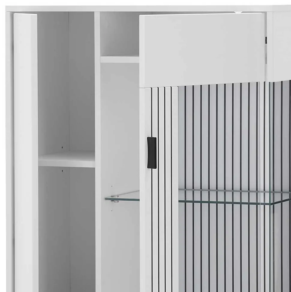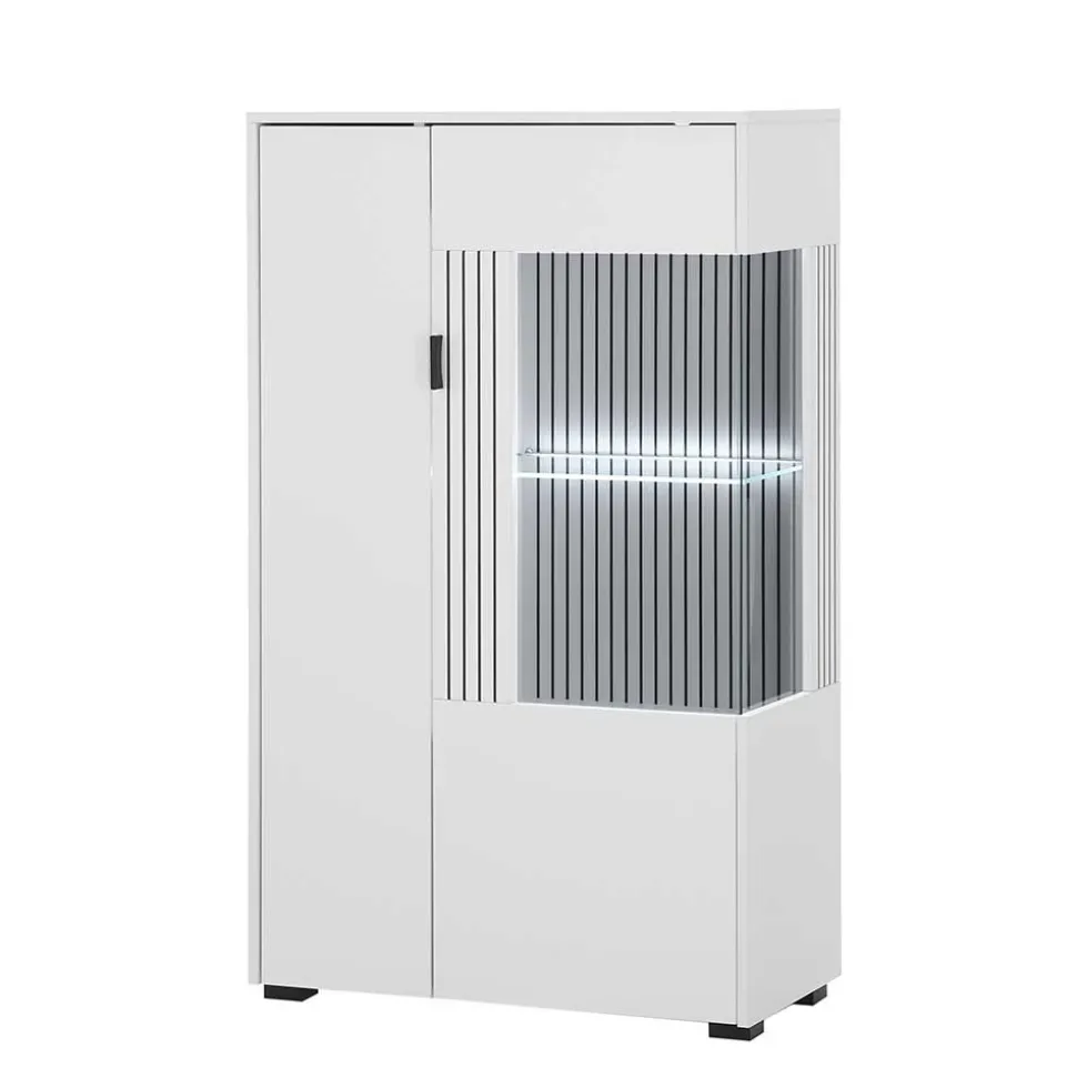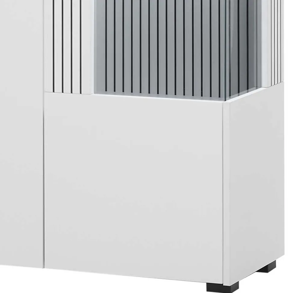 Die Wohnwand Kombination „Dualkos“ bringt mit ihrer klaren Linienführung und den modernen Designelementen eine zeitlose Atmosphäre in Ihr Wohnzimmer. Diese vierteilige Kombination aus zwei Highboards, einem TV-Board und einem Wandboard überzeugt durch ihre harmonische Gestaltung in Weiß und die subtilen, vertikalen Rillen in Schwarz, die auf einigen Flächen besondere Akzente setzen. Diese Details verleihen der Wohnwand eine gewisse Raffinesse, die den Raum aufwertet, ohne aufdringlich zu wirken.