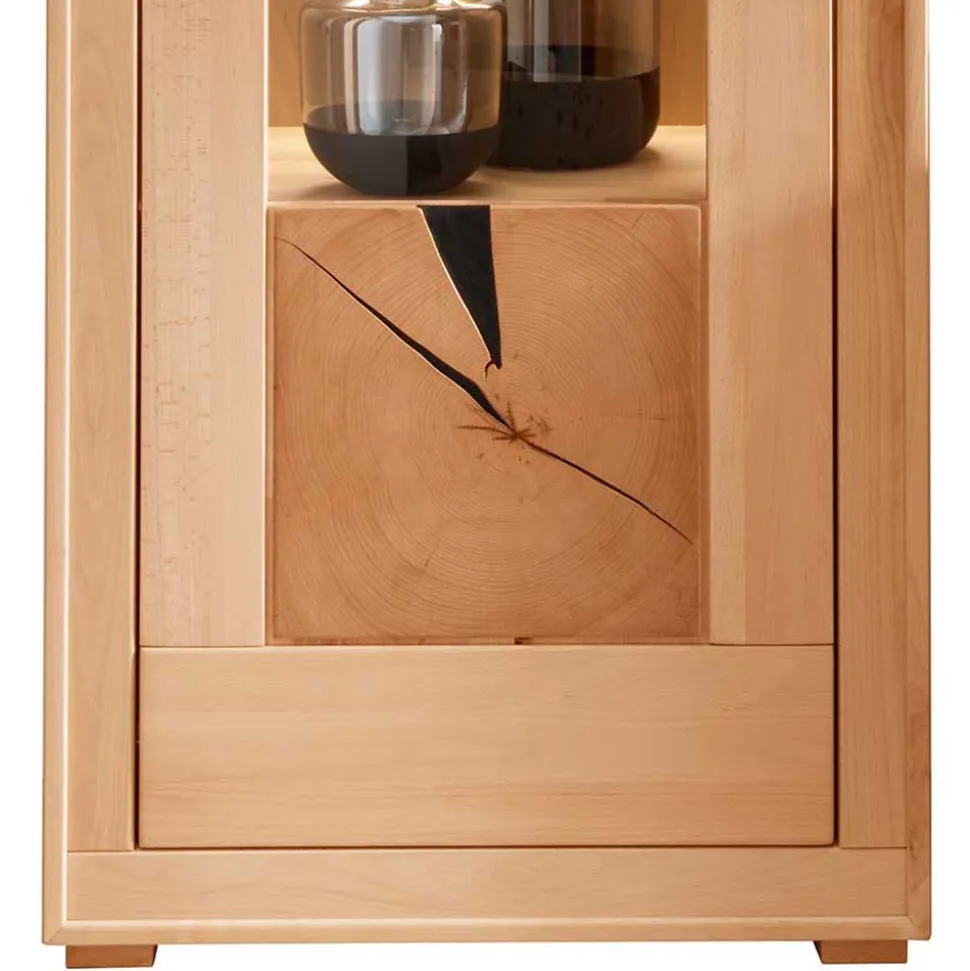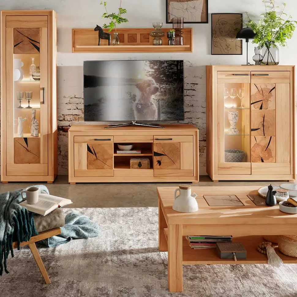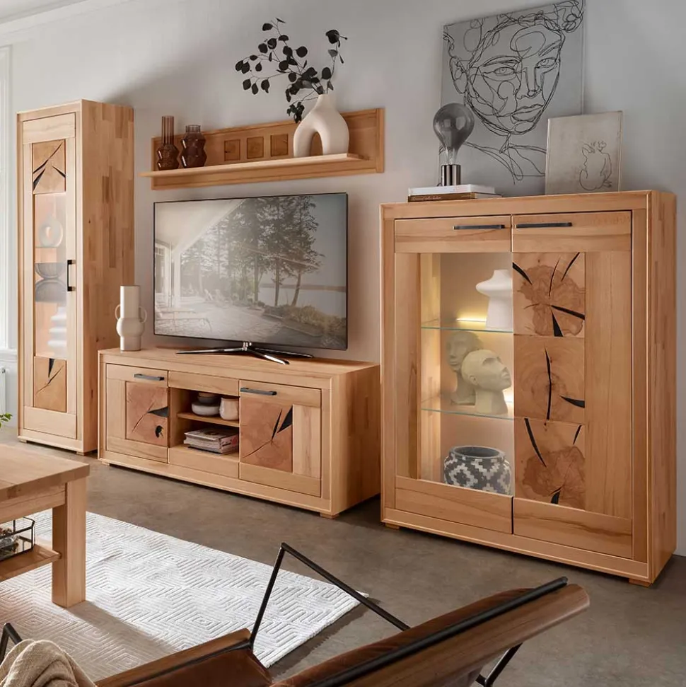 Die Wohnwand „Sarosca“ besteht aus einem Highboard, einem TV-Board, einer Vitrine und einem Wandboard. Sie ist nicht nur optisch ansprechend, sondern auch von hoher Qualität dank der Herstellung aus massivem Kernbuchenholz. Das verwendete Kernbuchenholz ist bekannt für seine Stabilität und seinen warmen Farbton. Mit seinen durchgehenden Lamellen in Deckplatten und Fronten sowie keilverzinkten Seiten und Innenausstattung bietet es eine beeindruckende Langlebigkeit und Ausdruckskraft. Es verleiht dem Möbelstück nicht nur Charakter, sondern auch eine einzigartige Ausstrahlung.Die natürlichen geölten Oberflächen unterstreichen die natürliche Schönheit des Holzes und bieten gleichzeitig Schutz. Diese Behandlung erhält die Atmungsaktivität des Holzes, unterstützt seine Fähigkeit, das Raumklima zu regulieren, und verleiht ihm eine angenehm glatte Oberfläche.
