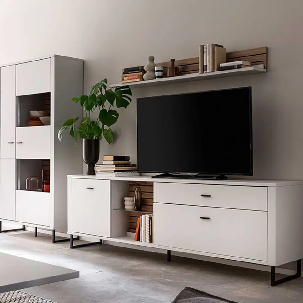 Das Herzstück Ihrer Wohnlandschaft ist unser TV Lowboard, perfekt abgestimmt auf die Ansprüche der modernen Ästhetik. Die Kombination aus Weiß und Wildeichefarben verleiht Ihrem Raum eine luftige Leichtigkeit, während die sichtbaren Rückwände in Eiche Paneel Optik mit Schattenfuge eine subtile, aber eindrucksvolle Note setzen. Diese Möbelstücke sind nicht nur funktional, sondern auch ein visuelles Statement für zeitgenössisches Wohnen.