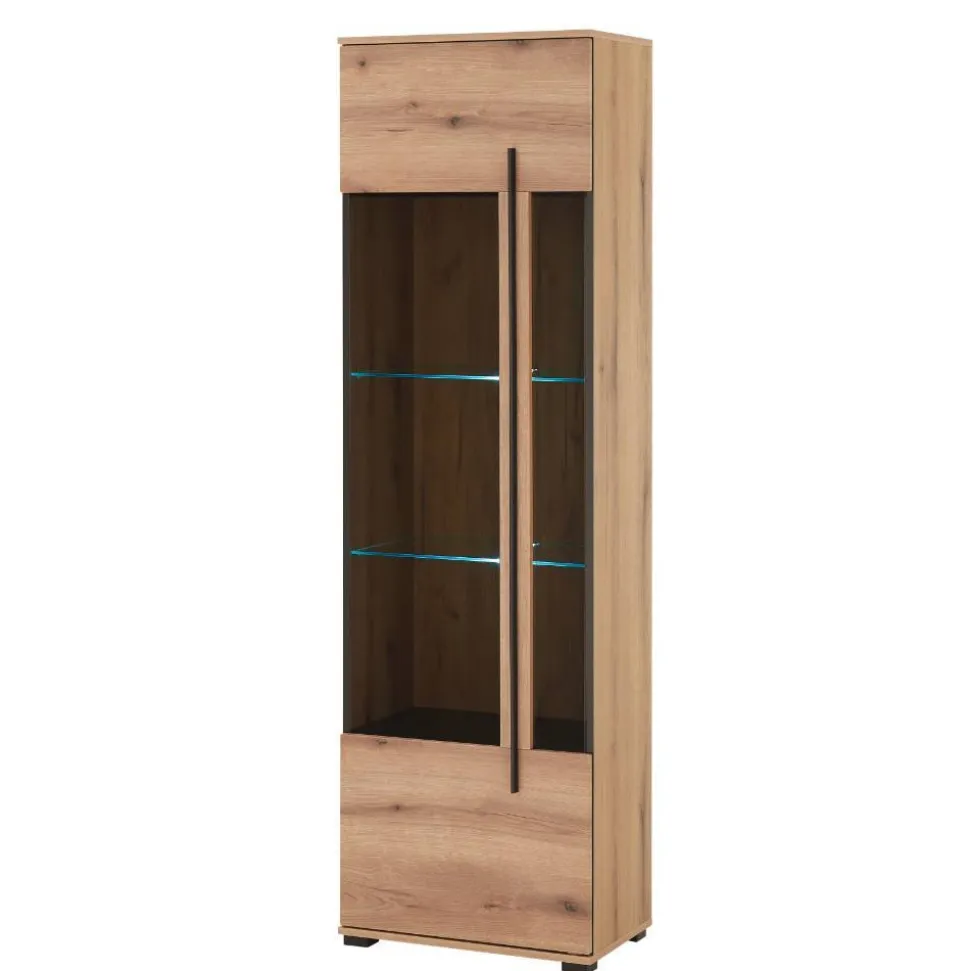 Wohnen gewinnt an Charakter, wenn ein Möbelstück nicht nur funktional, sondern auch ein Statement für Stil ist. Die Anbauwand Brocus verwandelt jedes Wohnzimmer in eine Oase der Ästhetik und des Komforts. Mit ihrem modernen Design und der harmonischen Kombination aus warmem Eiche-Dekor und eleganten schwarzen Griffleisten zieht sie alle Blicke auf sich. Das Set besteht aus einem großzügigen Vitrinen-Sideboard, einem formschönen Wandboard sowie zwei beeindruckenden Standvitrinen – perfekt aufeinander abgestimmt, um Ihrem Wohnraum Struktur und Eleganz zu verleihen.