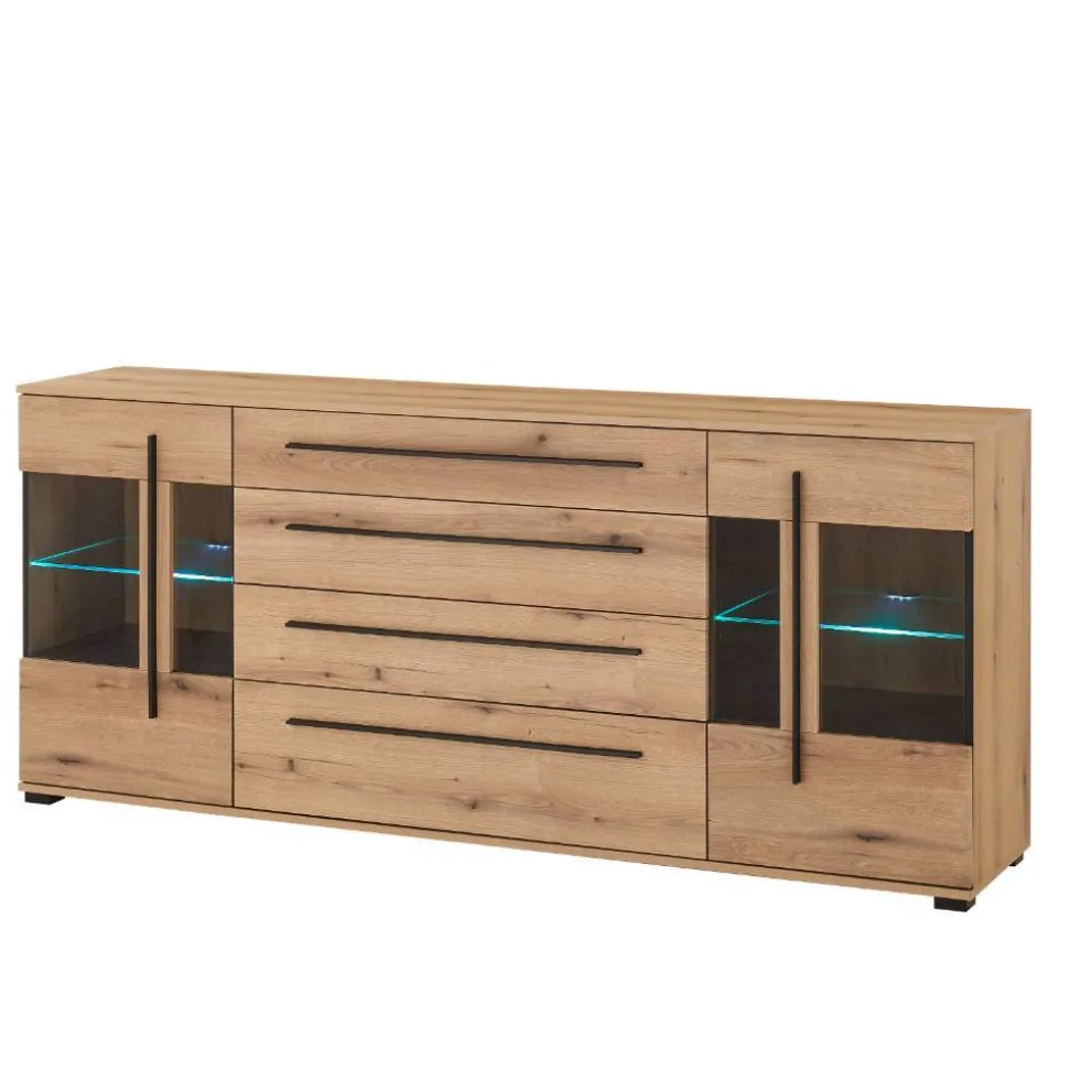 Jede Tür ist mit stabilen Metallbeschlägen ausgestattet, die eine langlebige Funktion garantieren. Dank beidseitig montierbarer Türanschläge können Sie die Aufstellung flexibel an Ihre Raumgegebenheiten anpassen. Die Schubladen gleiten sanft auf robusten Metallauszügen und lassen sich mühelos bedienen – ein spürbarer Komfort im Alltag. Die langen, schwarzen Kunststoff-Griffleisten setzen einen stilvollen Kontrast zur warmen Holzoptik und betonen das moderne Erscheinungsbild.