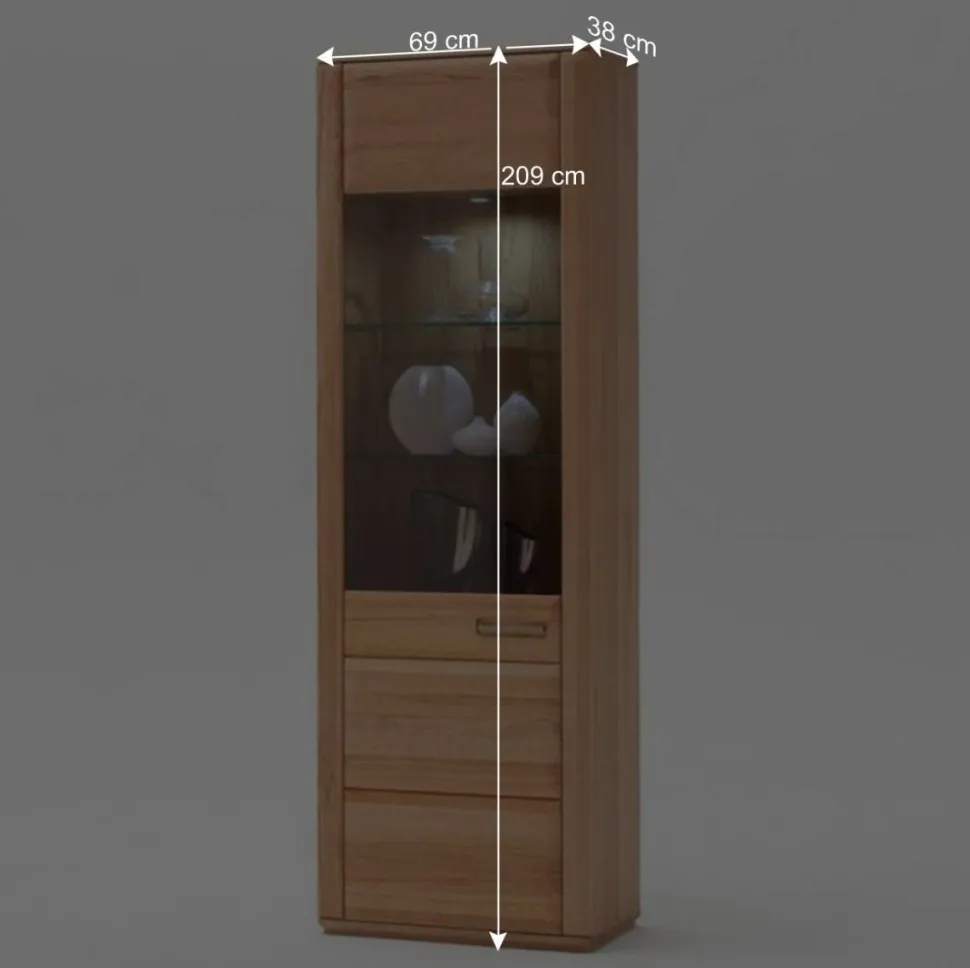 Der besondere Charakter der Vitrine „Athias“ wird durch die erlesene Materialauswahl erzeugt. Die Front besteht aus massiver Kernbuche, einem robusten, langlebigen und gleichzeitig ästhetisch ansprechenden Material. Die charakteristischen Maserungen und das warme, honigfarbene Holz der Kernbuche verleihen jedem Raum einen Hauch von Natur und Komfort. Der Korpus der Vitrine ist aus Spanplatte gefertigt und mit echtholzfurniert und geölt, was für ein harmonisches Gesamtbild sorgt.