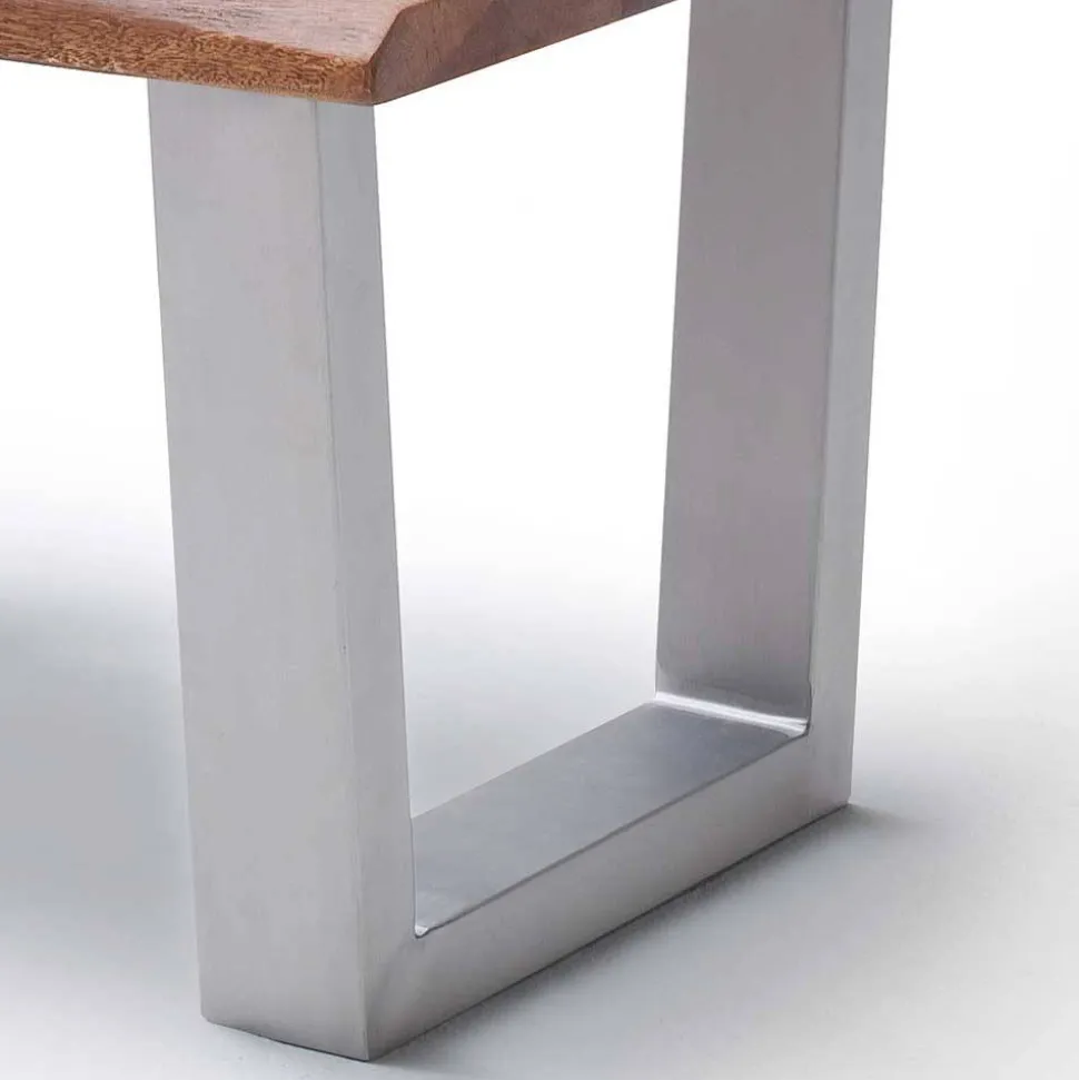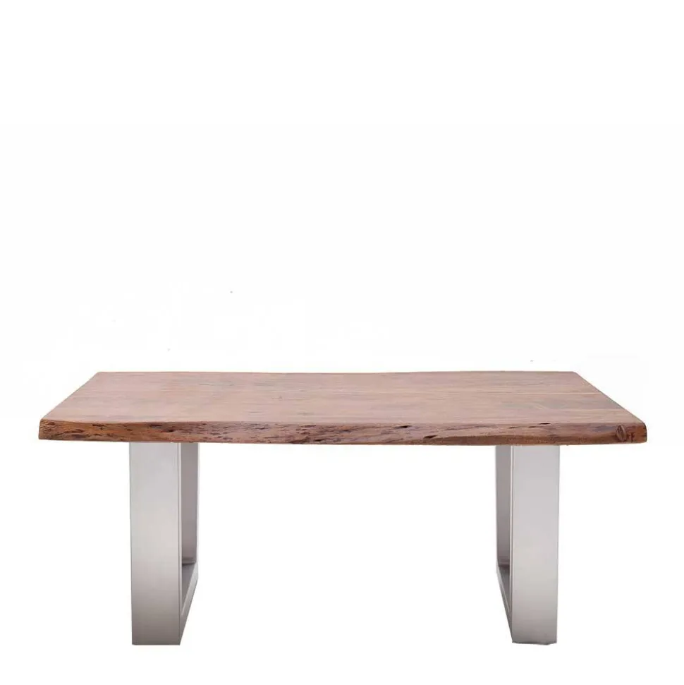 Die Tischplatte aus massivem Akazienholz ist das Herzstück dieses außergewöhnlichen Möbelstücks. Akazienholz zählt zu den härtesten und langlebigsten Hölzern der Welt – ein Garant für Qualität und Wertbeständigkeit. Zudem überzeugt es durch seine faszinierende Maserung und lebendige Farbstruktur, die jeden Tisch zu einem Unikat macht. Wuchsrisse, Astlöcher und natürliche Unebenheiten sind keine Makel, sondern gewollte Elemente, die den ursprünglichen Charakter des Holzes unterstreichen.
