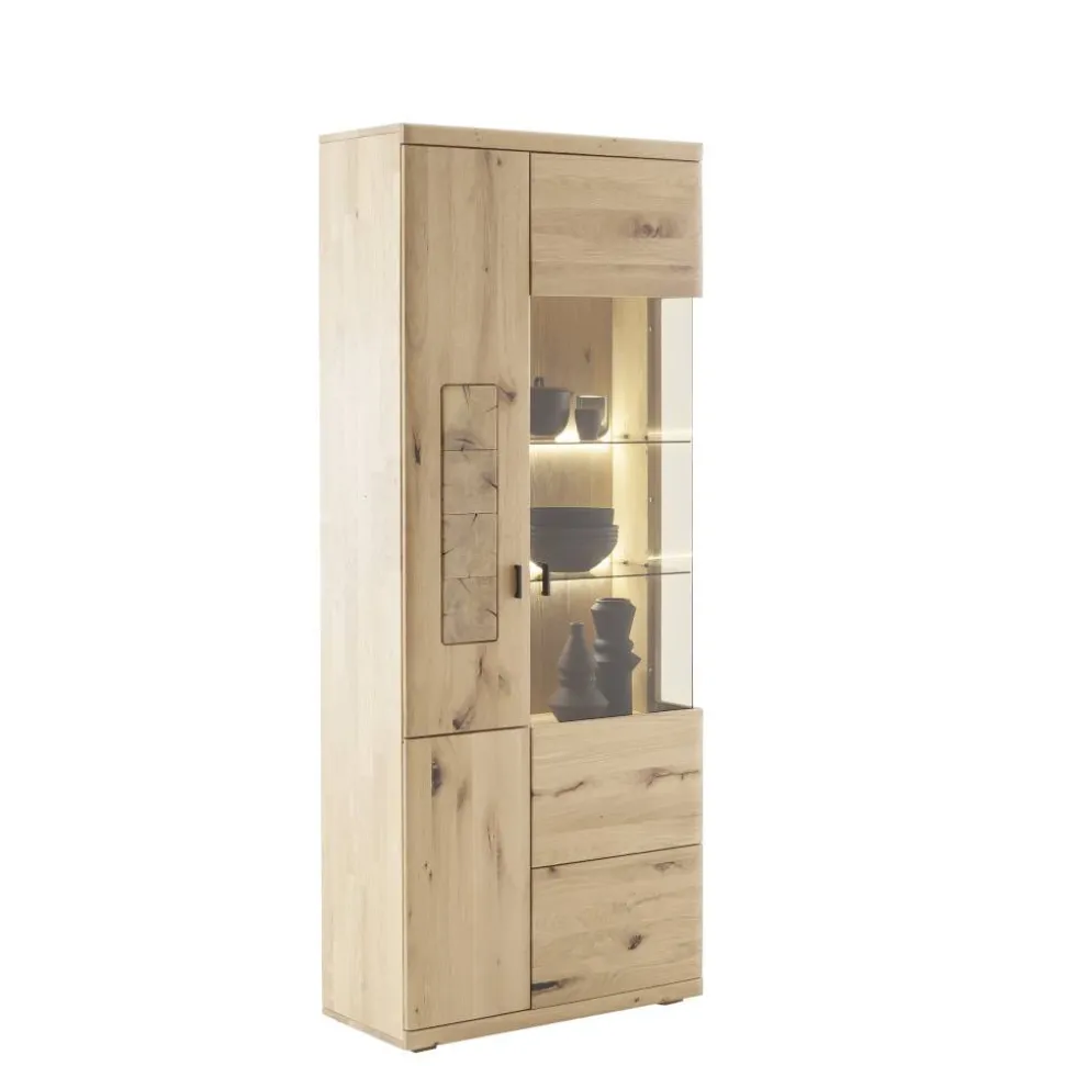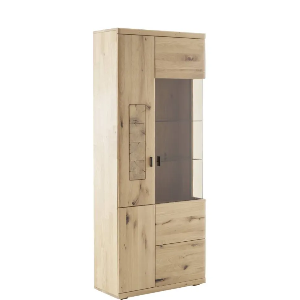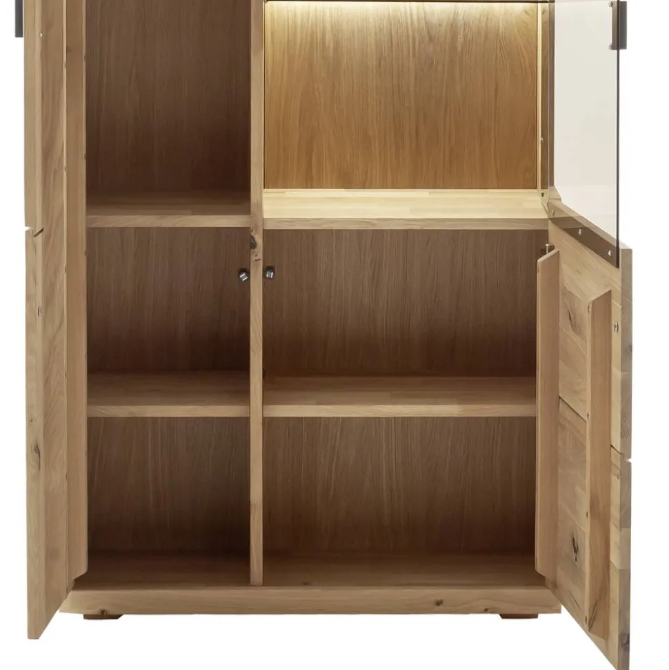 - Holzoberflächen hell geölt, Front durchgehende Lamelle, Korpus keilgezinkt, Rückwände innen mit Asteiche hell echtholzfurniert