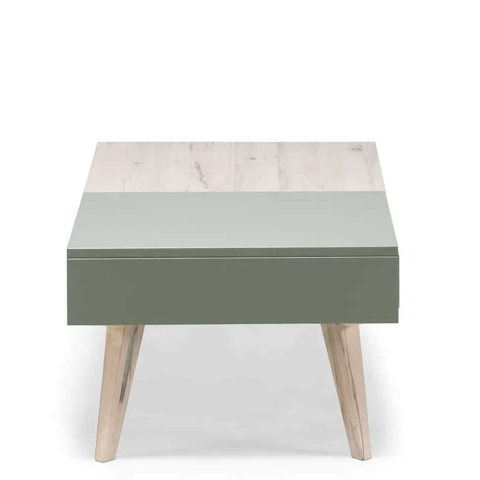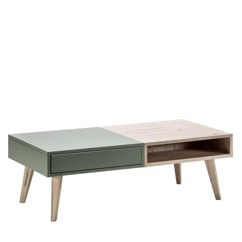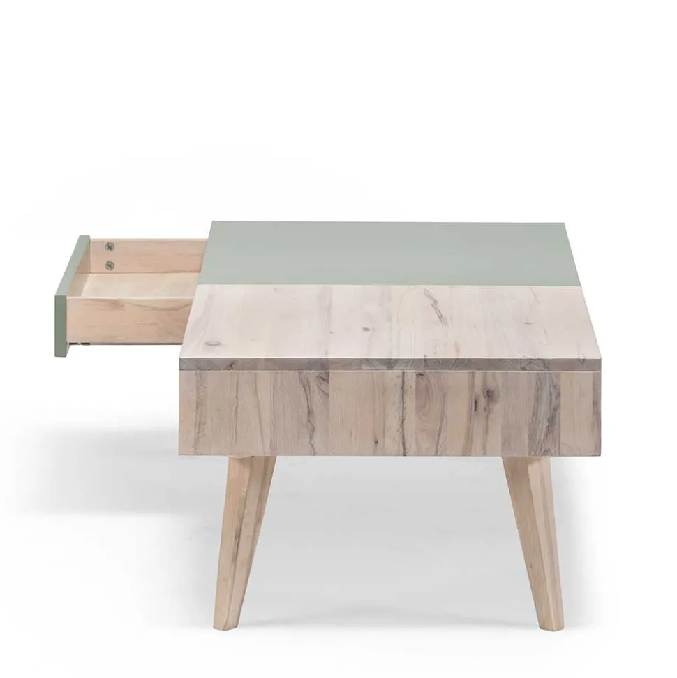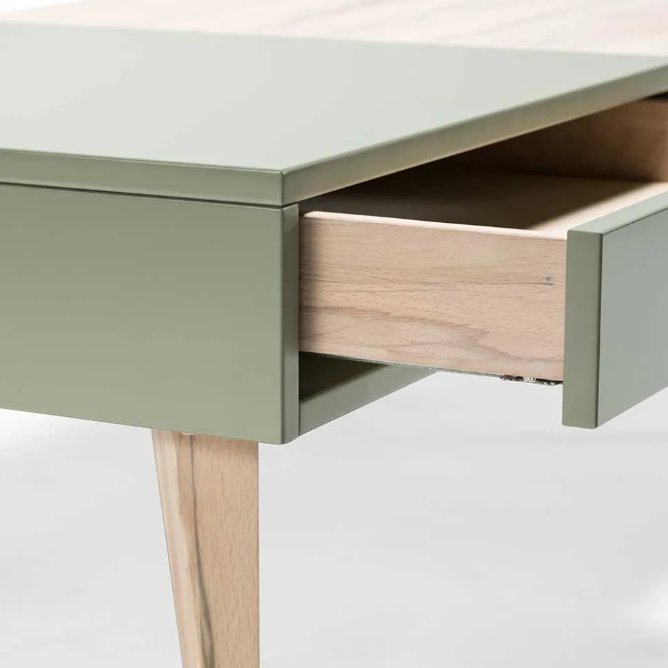 Der Tisch bietet nicht nur eine großzügige Tischplatte, sondern auch praktischen Stauraum. Ein Schubkasten mit gedämpftem Metallauszug und Push-to-open Funktion ermöglicht Ihnen ein sanftes Öffnen und Schließen. Die dezent grifflose Optik verleiht dem Tisch eine moderne Note. Zusätzlich steht Ihnen ein offenes Fach zur Verfügung, in dem Sie Kleinigkeiten griffbereit aufbewahren können.