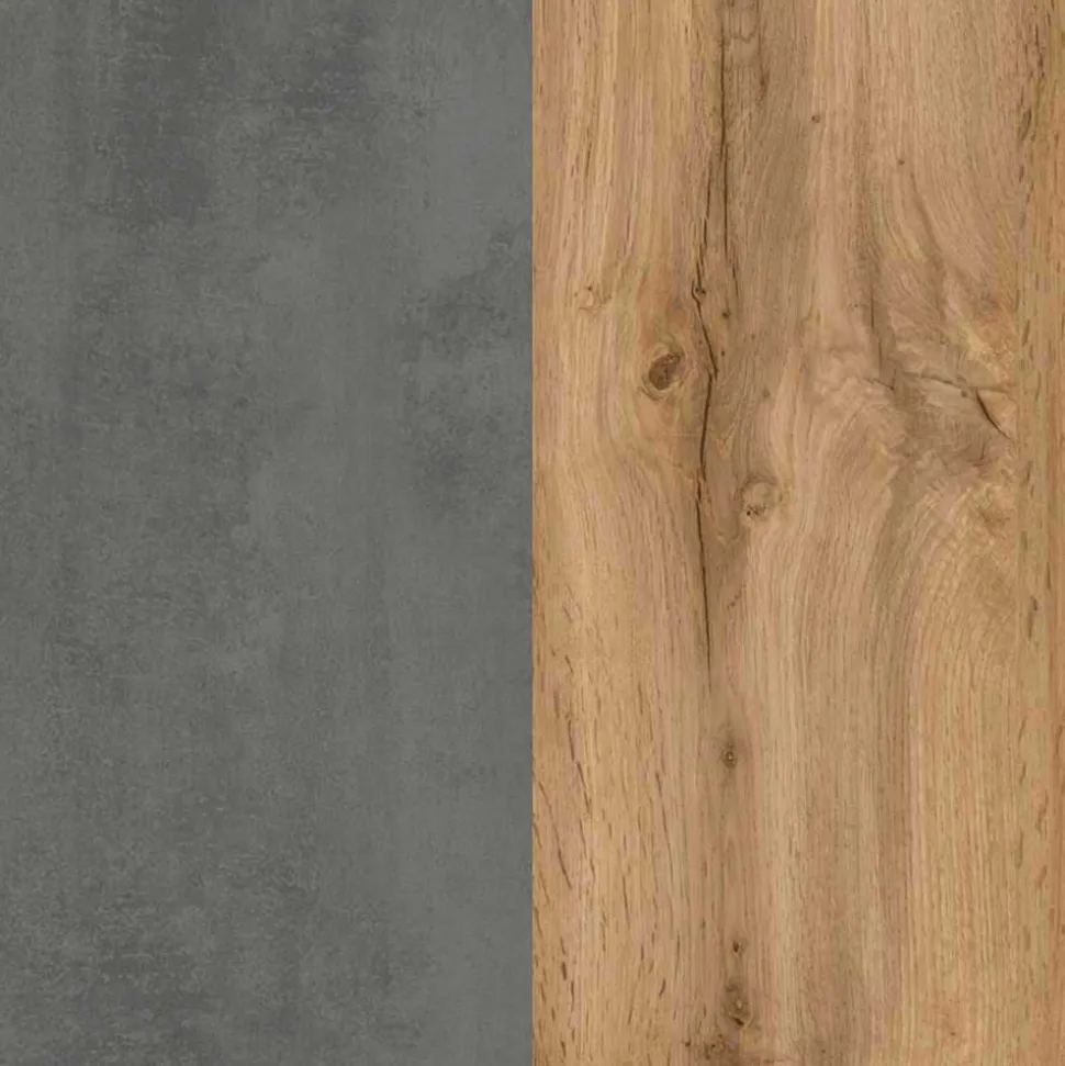 - Korpus und Tür in Holzoptik Wildeiche melaminbeschichtet, Front tiefgezogen betongrau foliert